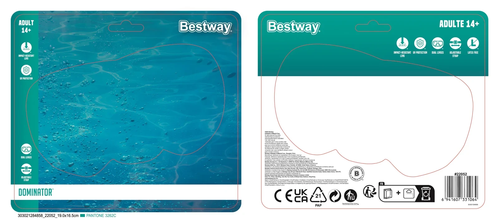 Polykarbonátové čočky s UV ochranou chrání oči před slunečním zářením, zatímco dvojitý lem zajišťuje dokonalé přilnutí k obličeji a minimalizuje průnik vody. Nastavitelný dělený silikonový pásek umožňuje snadné přizpůsobení pro pohodlné nošení.