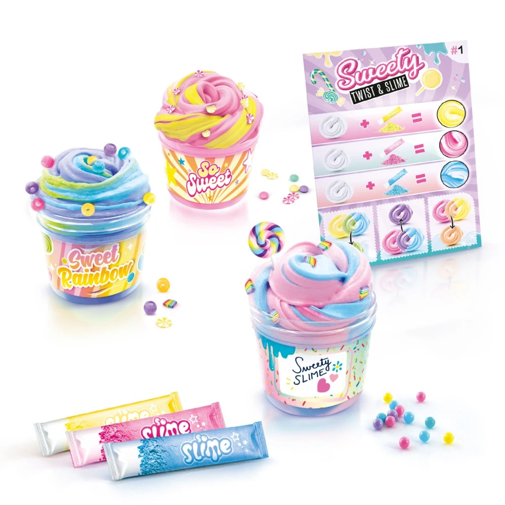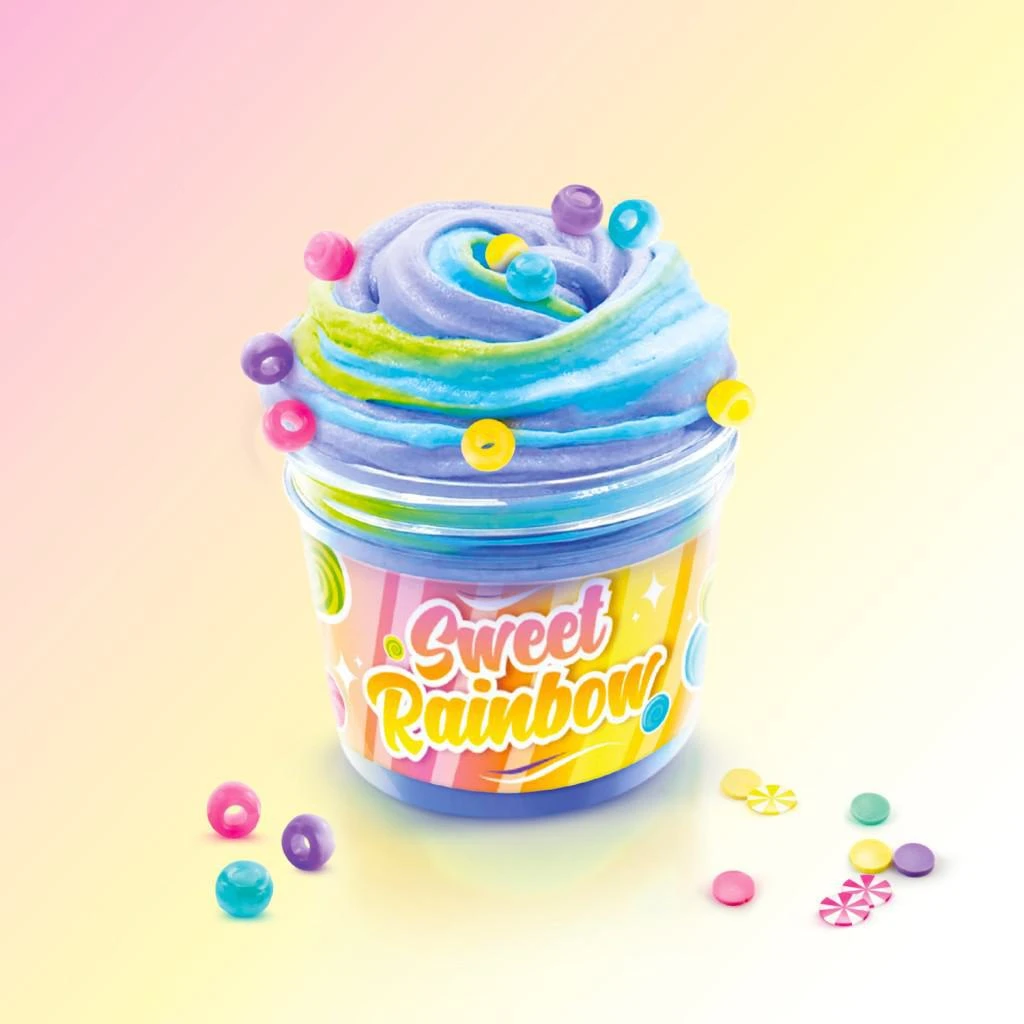 Obsah: 1 sáček průhledného slizu, 6 sáčků práškové barvy do sliz, 5 druhů ozdob do slizu, 6 x kelímek, 1 karta s recepty na sliz, 1 arch samolepek na kelímky.