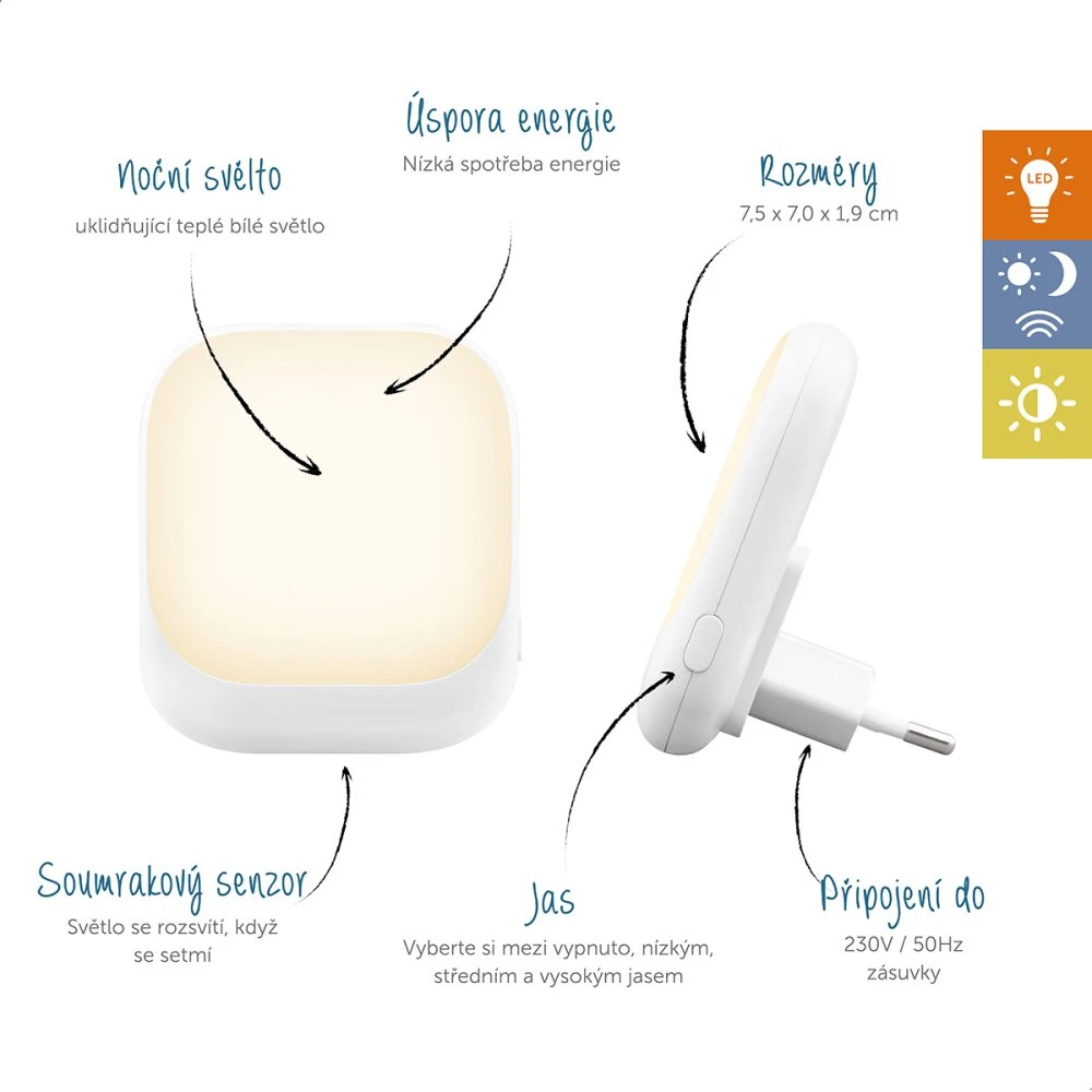Díky jemnému a tlumenému světlu usnadňuje orientaci v noci, například při cestě na toaletu, a pomáhá překonávat strach ze tmy. Vestavěný senzor soumraku automaticky zapíná světlo při setmění a ráno jej opět vypíná – bez nutnosti manuálního ovládání.