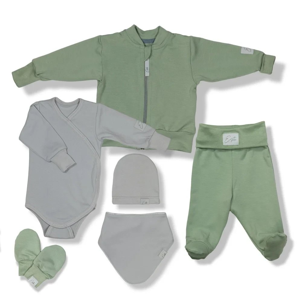Šestidílná soupravička do porodnice pro miminko Bambus Olive obsahuje: