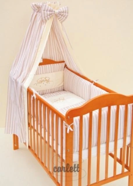 Povlečení je vyrobeno ze100% bavlny. Výplň-polyester-duté vlákno. Tato souprava je určená na postel 120 x 60 cm. Držák nebes, výplň polštářku a peřinky není součástí soupravy. (do potahu límce je všitý zip, potah límce se pere samostatně)