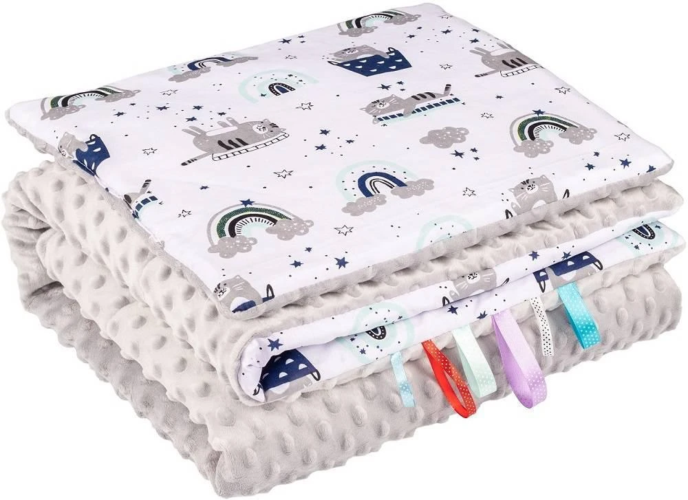 Izolace přikrývky je přizpůsobena ročnímu období. Polštářek, který je součástí sady, je plochý - cca 2 cm vysoký, vyrobený speciálně pro děti. Deka má bezpečně všité barevné stuhy, které vaše dítě zaujmou a zajistí mu zábavu a rozvoj rukou. Barvy stuh se mohou lišit od barev na obrázcích. Schválené materiály deky zaručují vysokou kvalitu výrobku a dlouhou životnost. Sada je oboustranná.