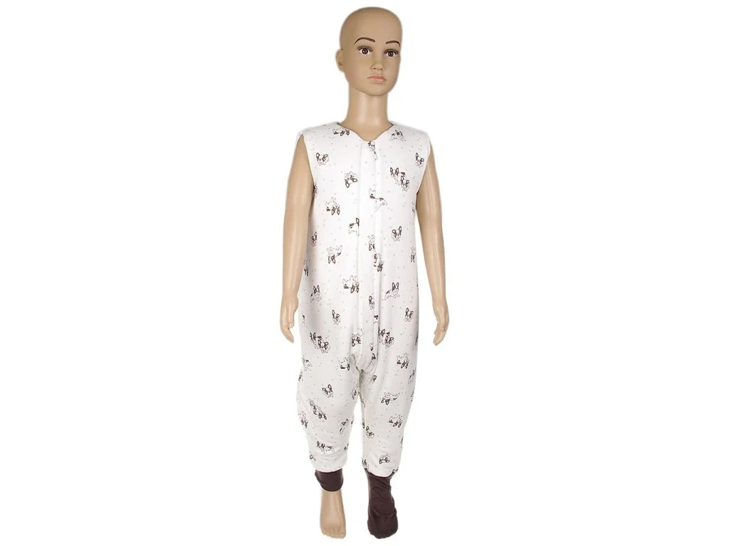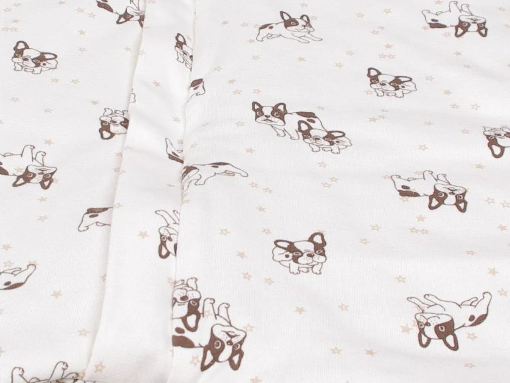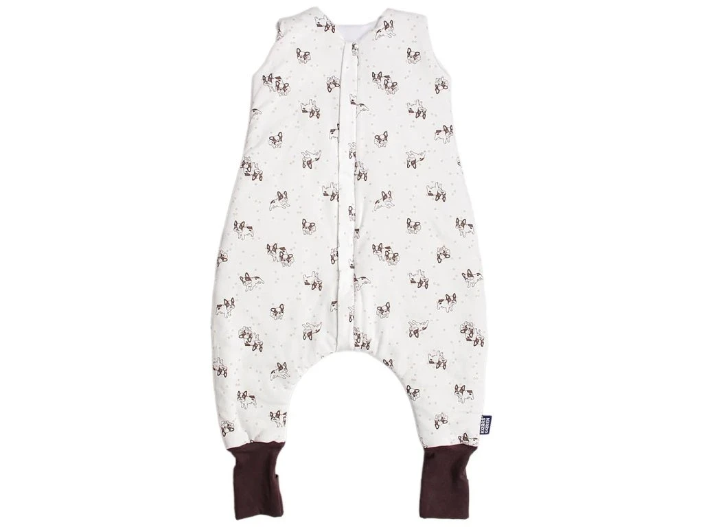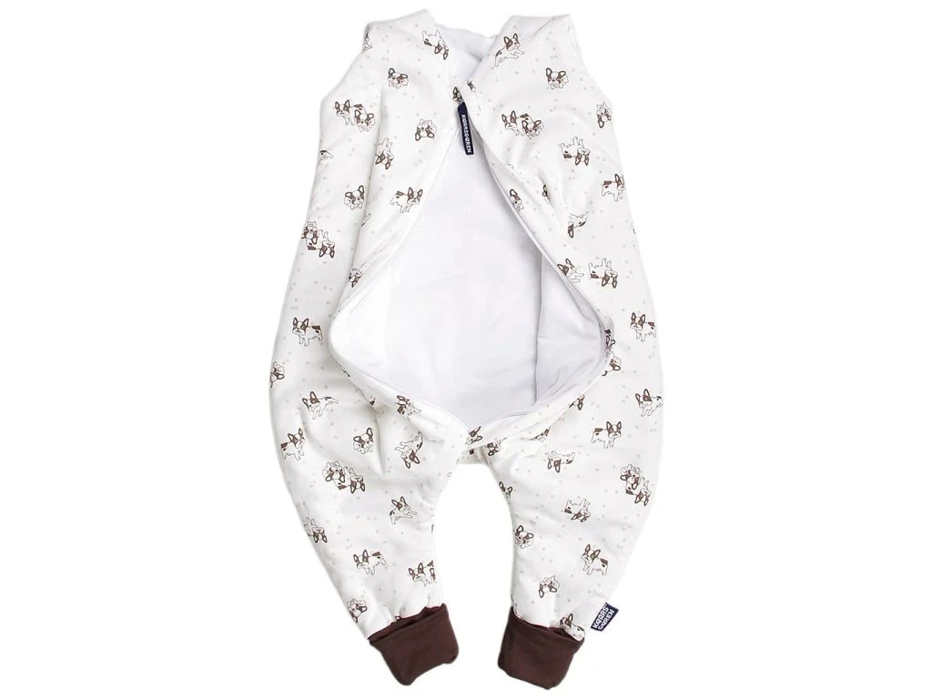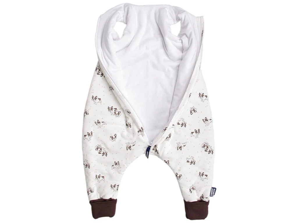 Nožičkový spací pytel s motivem buldočků je pohodlný na spaní i jako celodenní overal. Díky otvorům pro nohy umožňuje volný pohyb aktivním dětem.