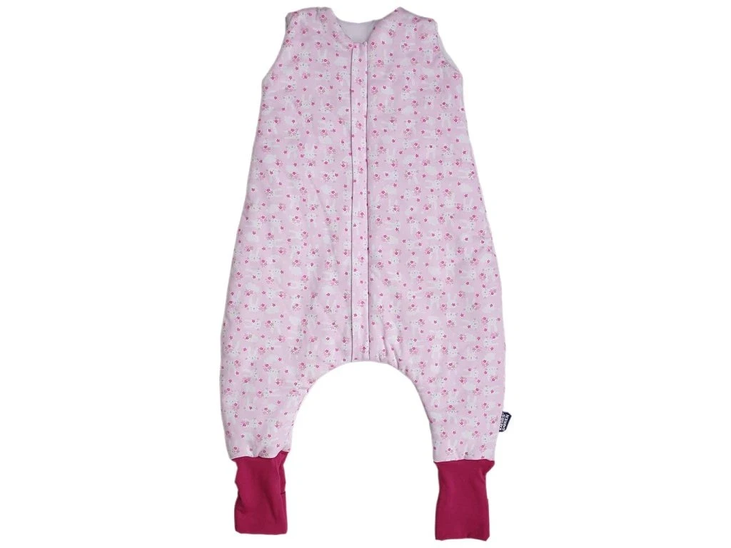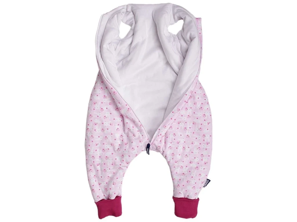 Nožičkový spací pytel v jemně růžovém provedení se zajíčky je ideální pro klidný spánek i pohodlné denní nošení. Díky nohavicím poskytuje dítěti volnost a zároveň příjemné teplo.