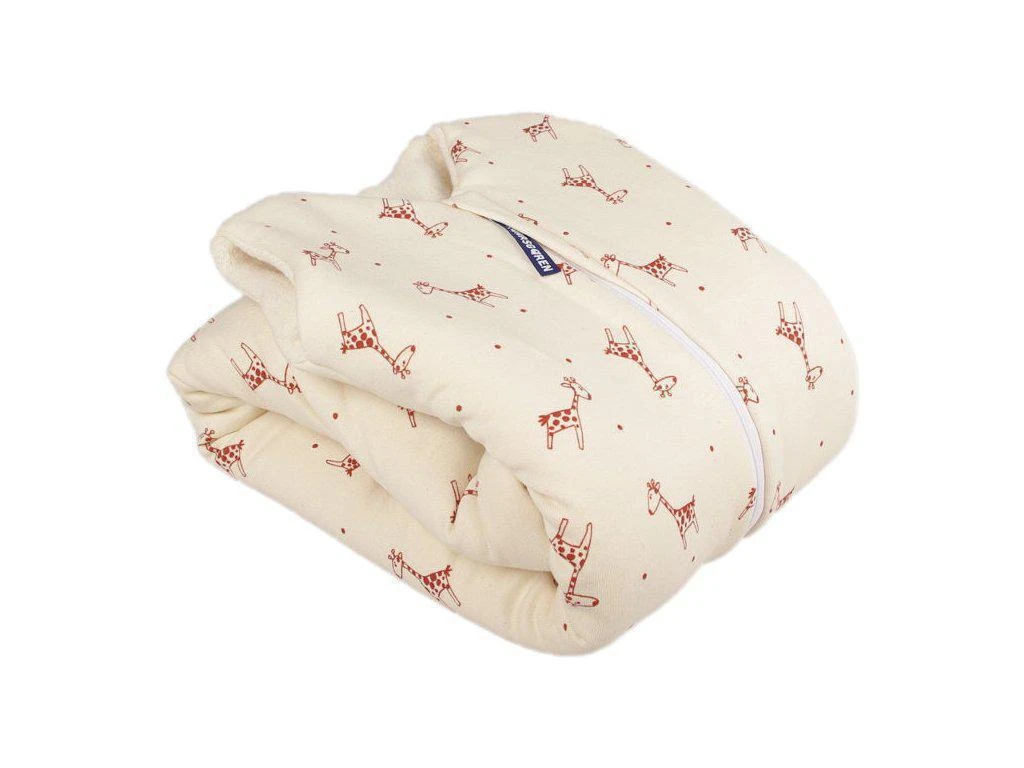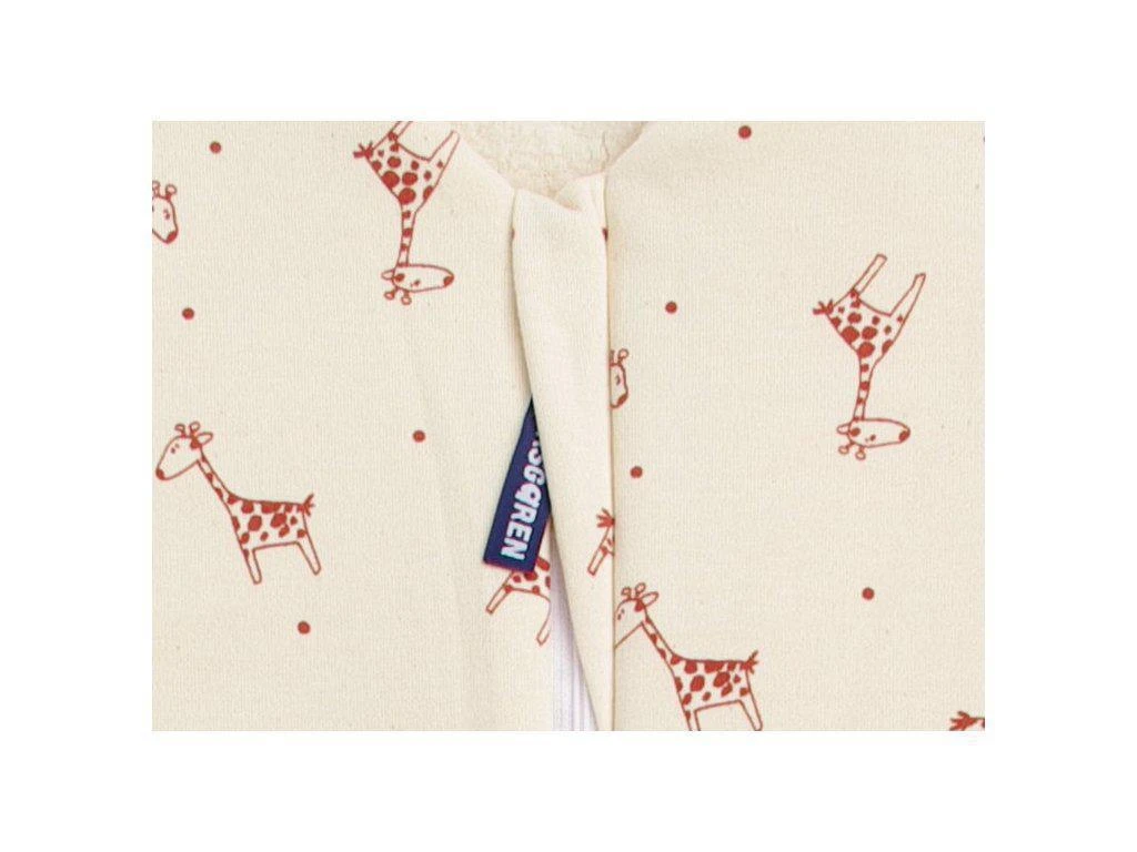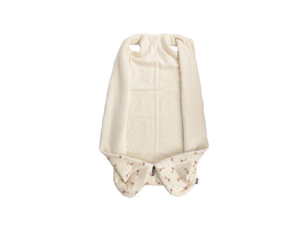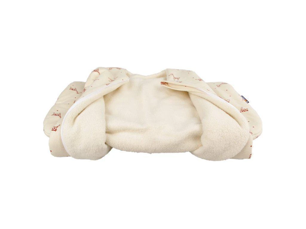 Je vyrobený ze tří vrstev materiálu: vnější materiál je 100% hladká biobavlna, uvnitř je zateplený antibakteriálním rounem a podšívka je ze 100% biobavlny v úpravě beránek. Zip umožní otevření spacího pytle po celé délce a má nahoře látkovou krytku, která zabraňuje přiskřípnutí krku do zipu.