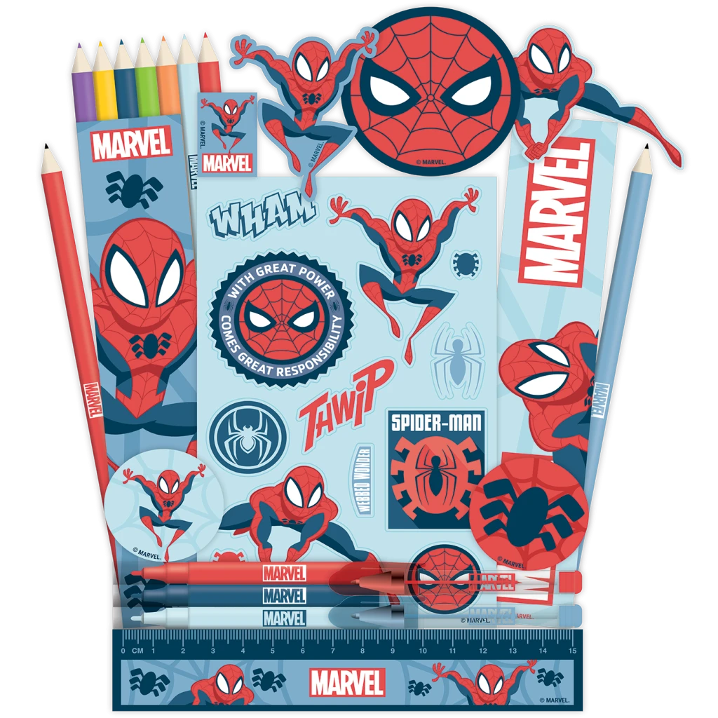 S papírenským adventním kalendářem Spiderman bude čekání na Vánoce plné akce! Každé okénko skrývá překvapení pro všechny malé superhrdiny a fanoušky marvelovského světa. Kalendář obsahuje 1 pravítko (15 cm), 1 ořezávátko, 2 gumy, 2 záložky, 3 mini vodové fixy, 7 mini pastelek, 2 mini gelová pera, 2 tužky HB, 3 magnetky a 1 arch samolepek. Každý den nový dárek, který potěší školáky i kreativní děti. Perfektní spojení zábavy, užitečnosti a hrdinského stylu.