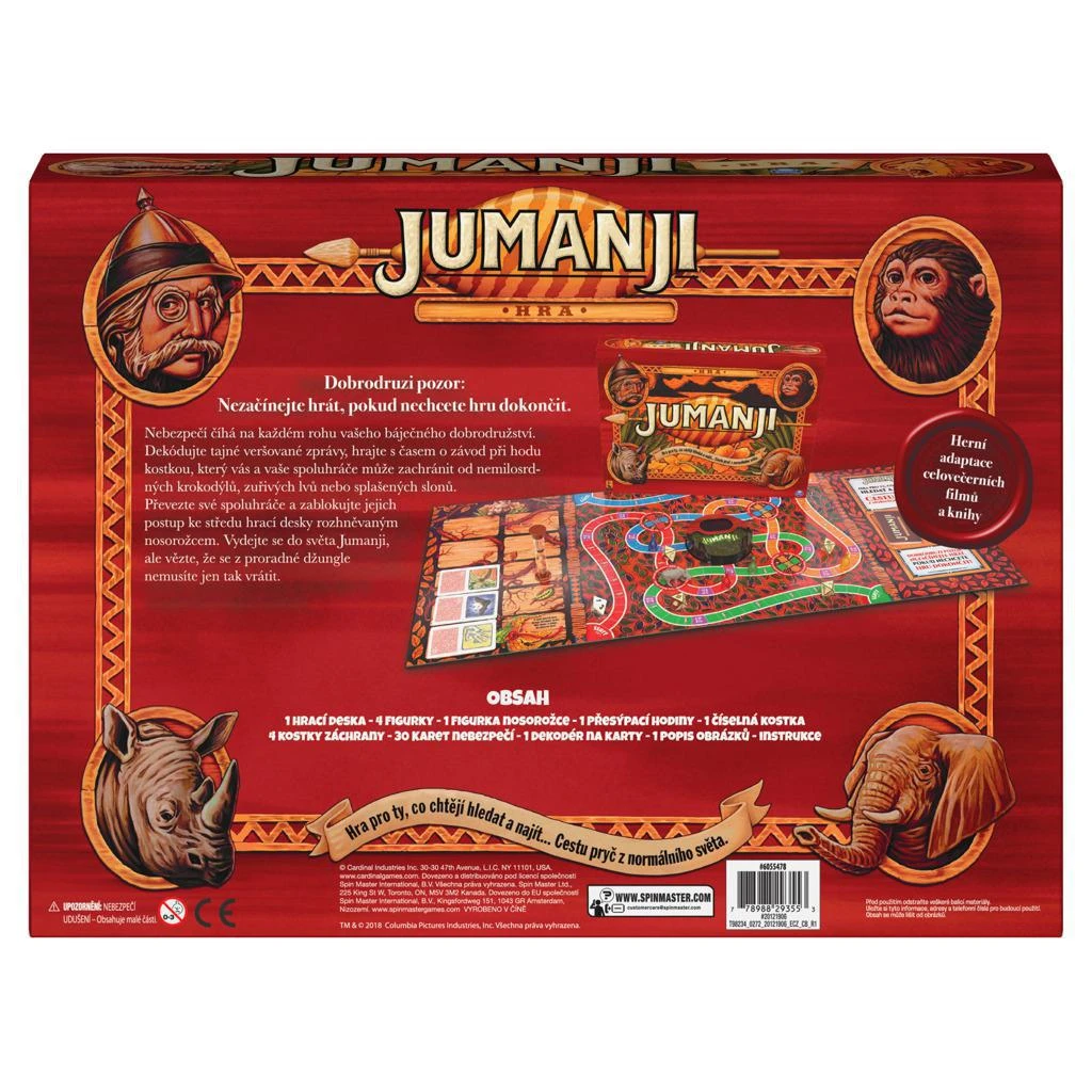 Zažij stejná dobrodružství se společenskou hrou Jumanji, jako ve stejnojmenném známém filmu. Pronásledování lvy, střet s nosorožci a útočící krokodýli jsou jen začátkem nebezpečí v divokém světě Jumanji. Hoďte osmistrannou kostkou a uvidíte, co vás čeká. Karta nebezpečí vám s pomocí dekodéru pomůže rozluštit tajnou zprávu, zachraňte se před koncem světa. Všichni hráči závodí s časem, aby přežili. Džungle je děsivá. Pokud se naplní Oblast zkázy, džungle vás a vaše spoluhráče porazí. Jediným východiskem je dokončit hru.“ Obsah hry: „1 hrací deska, 4 barevné figurky, 1 figurka nosorožce, 1 přesýpací hodiny, 1 číselná hrací kostka, 4 kostky záchrany, 30 karet nebezpečí, 1 dekodér, 1 návod.