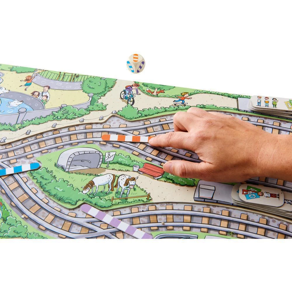 Hra obsahuje: 1 velká hrací deska skládačky, 3 barevné výhybky, 1 výhybka, 1 vlak, 24 dílků pro cestující, 4 dílky nádraží a návod ke hře.