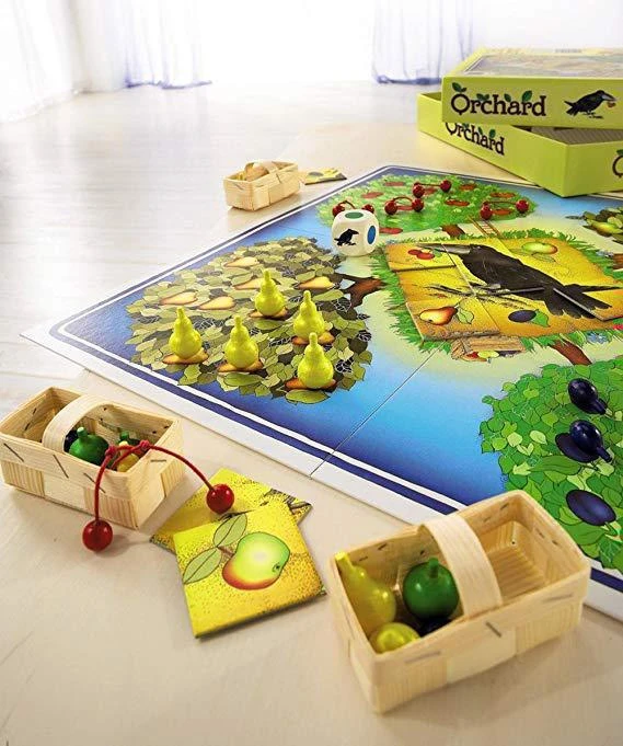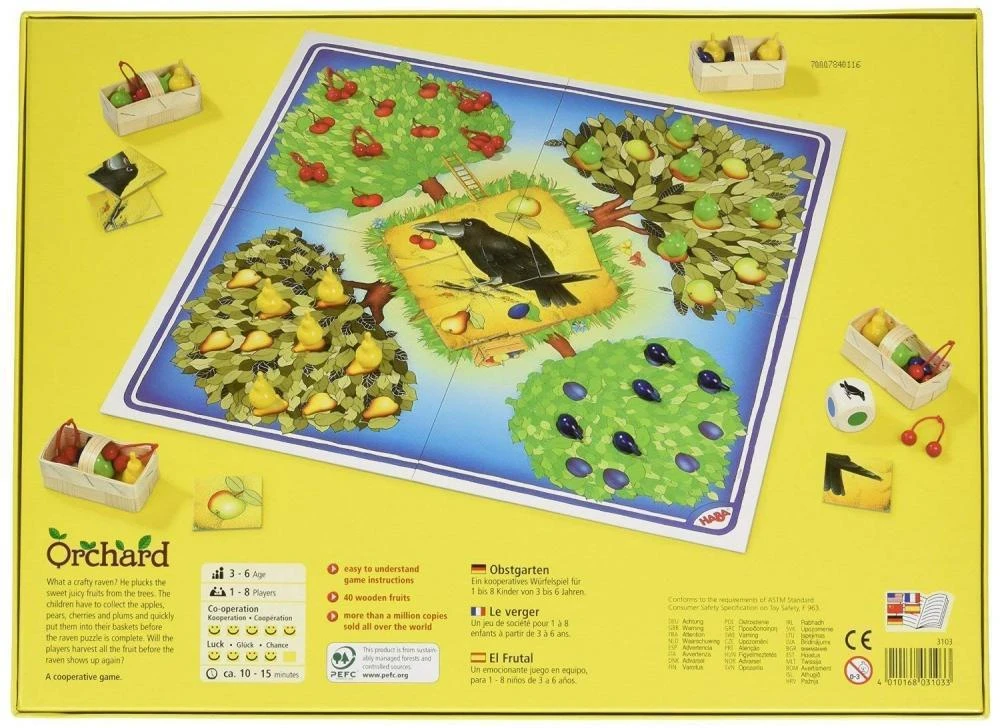 Snadno pochopitelná kooperativní desková hra pro děti od 3 let. Stromy v sadě jsou plné ovoce, úkolem hráčů je jejich ochránit před drzým krkavcům. Záleží, jaký symbol padne na kostce. Podle toho hráči umístí ovoce buď do košíku, nebo k krkavci.