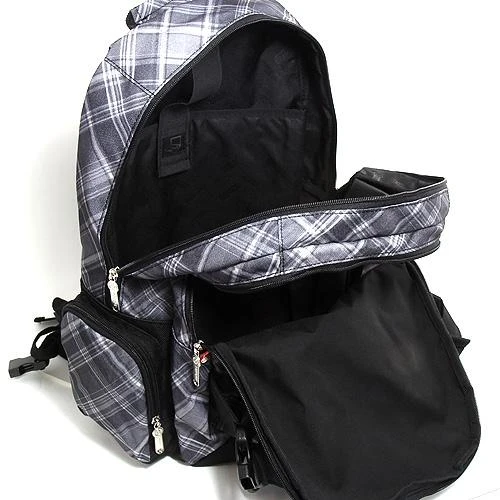 Batoh též disponuje předními popruhy na přezku pro umístění skateboardu nebo jiného sportovního vybavení.