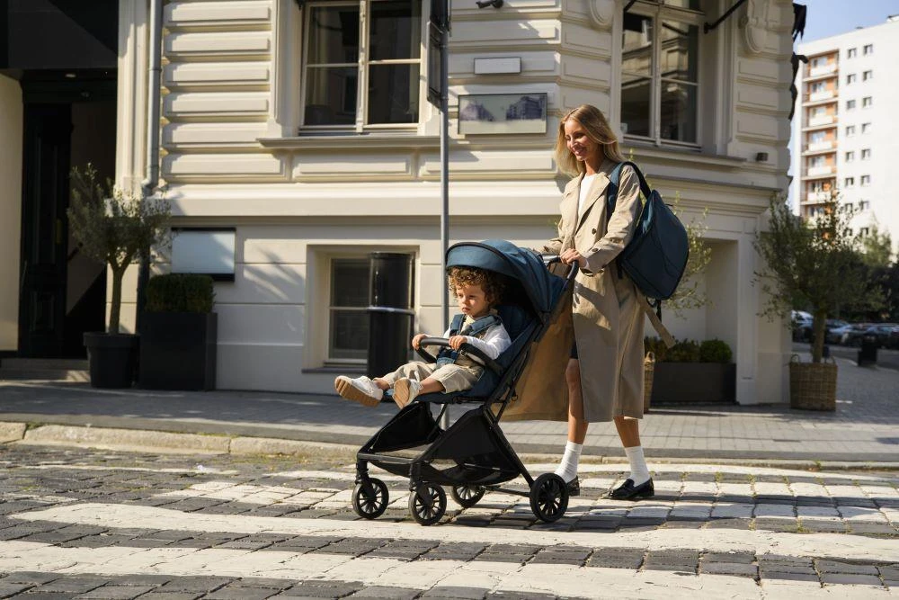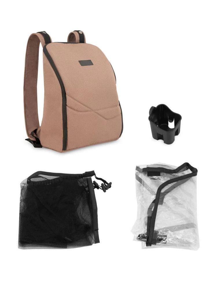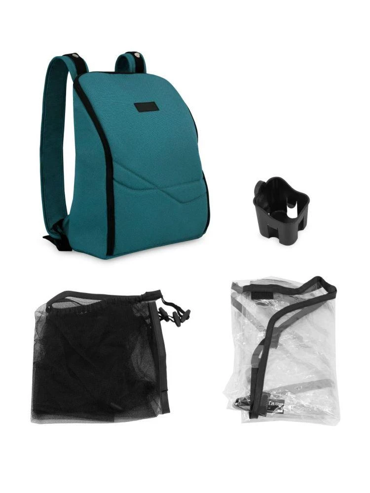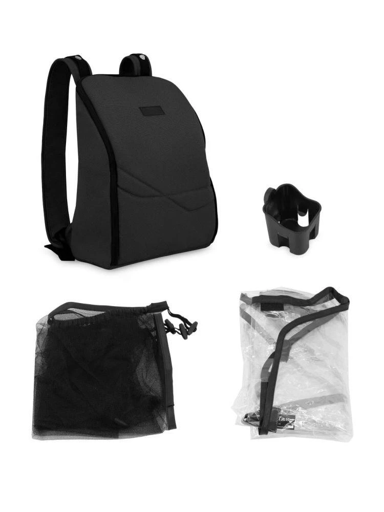 Příslušenství v sadě - batoh, držák na nápoje, moskytiéra a pláštěnka - zpříjemní procházku bez ohledu na počasí. Batoh lze také snadno zavěsit na rukojeť kočárku.