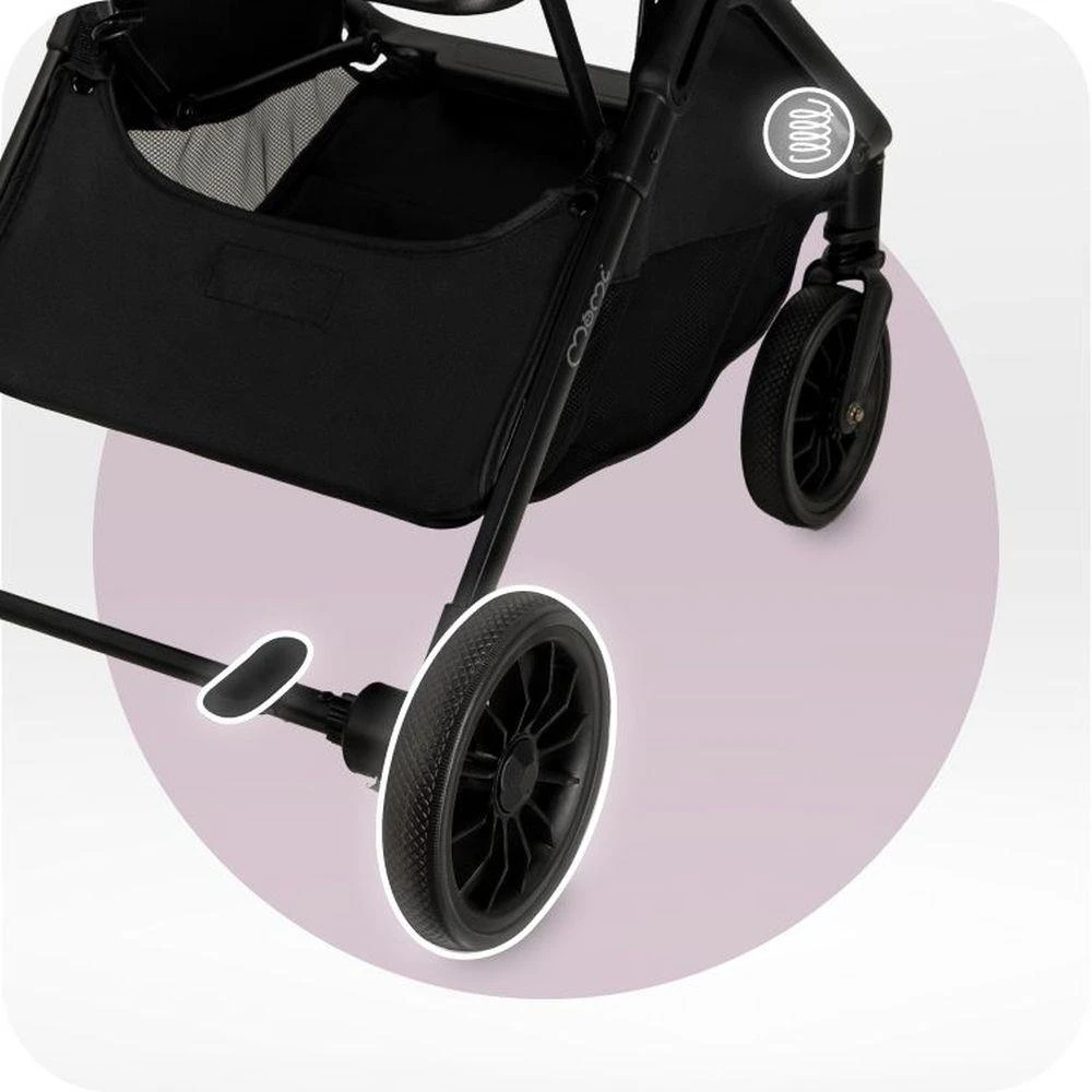 Kočárek je vybaven pevnými koly z pěny EVA odolné proti propíchnutí, a to v následujících velikostech: V přední části jsou kola o průměru 6,5“ a v zadní části 7“, která zajišťují hladkou jízdu i v náročném terénu.