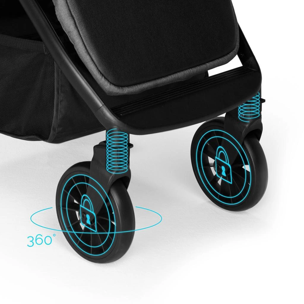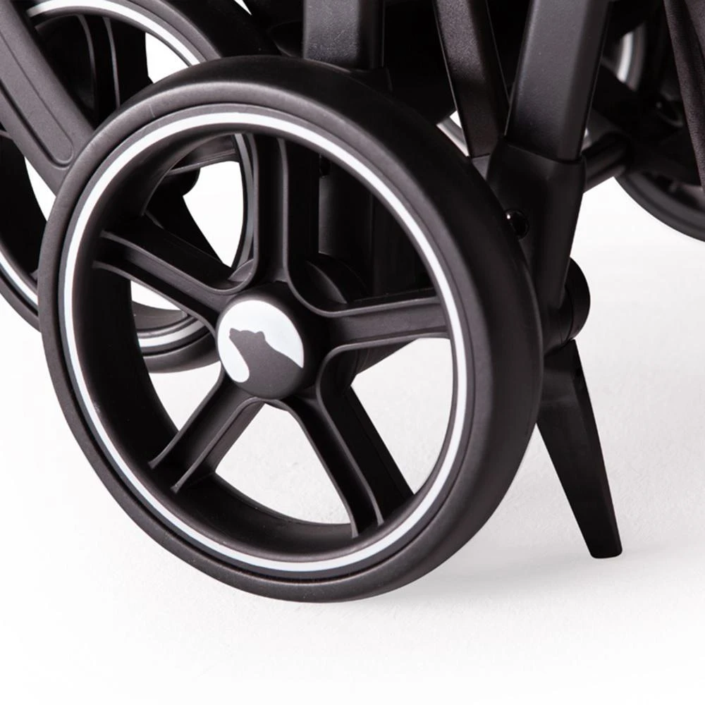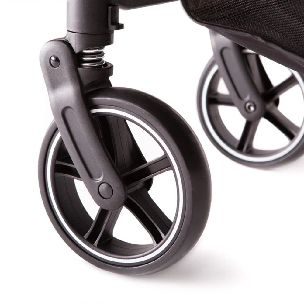 Kočárek má u všech kol tlumení nárazů, což zajišťuje vysoký komfort pro dítě. Navíc měkká EVA kola (velikost přední 7", zadní velikost 10,5") snižují otřesy a nevyžadují pumpování. Přední kola se otáčí o 360°, které v případě potřeby lze zaaretovat. Všechna kola se dají snadno odejmout pro pohodlnou přepravu kočárku.