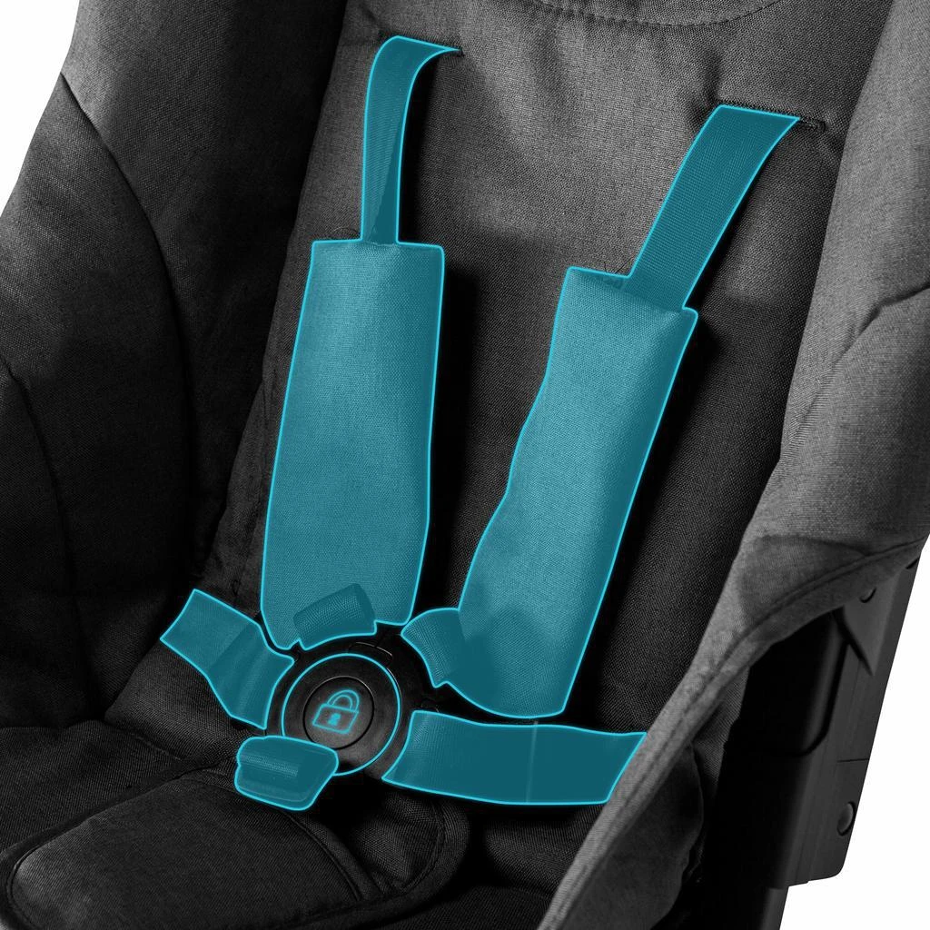 Kočárek FJÄLLRÄV má 5-ti bodové bezpečnostní pásy a pásek v rozkroku. Délku pásů a výšku uchycení postrojů lze nastavit. Díky tomu je můžete přizpůsobit výšce dítěte.