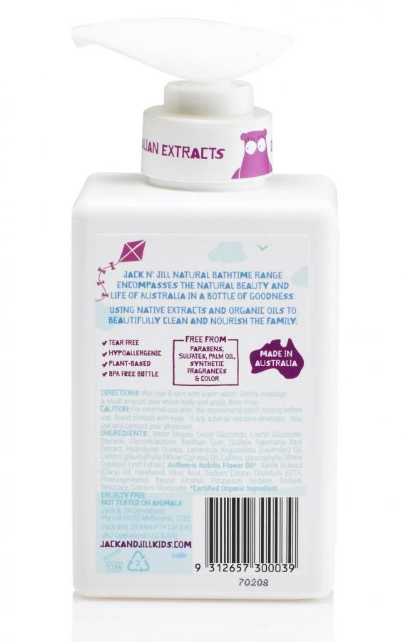 Složení: Water (Aqua), Decyl Glucoside, Lauryl Glucoside, Glycerin, Sodium Citrate, Gluconolactone, Xanthan Gum, Quillaja Saponaria Bark Extract, Chenopodium Quinoa Seed Extract, Lavandula Angustifolia (Lavender) Oil, Callitris glaucophylla (White Cypress) Oil, Callitris glaucophylla (White Cypress) Leaf Extract, Anthemis Nobilis Flower Oil**, Salvia Sclarea (Clary) Oil, Panthenol, Citric Acid, Disodium EDTA, Sodium Benzoate, Calcium Gluconate, Linalool*, Limonene*. *Naturally occurring in the Essential Oils, **Certified Organic Ingredients.