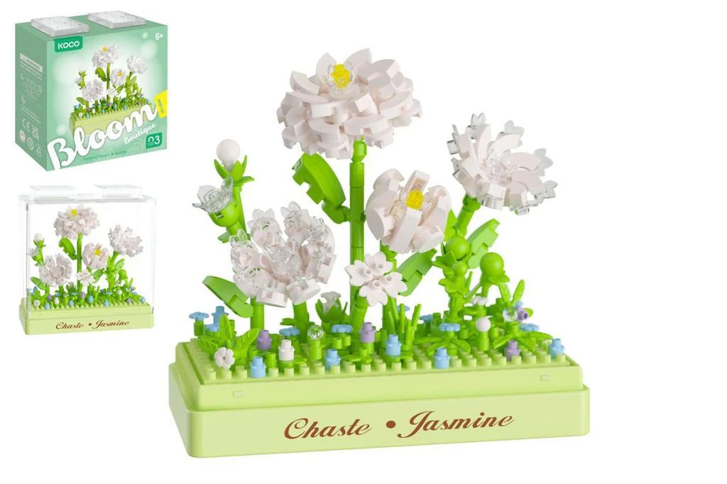 Rozkveť s jemností jasmínu! Mini stavebnice KOCO Jasmín obsahuje 285 plastových dílků, ze kterých si sestavíš elegantní květinu s propracovanými okvětními lístky a zeleným stonkem.