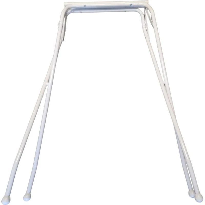 Konstrukce stojanu je vyrobena z pevného kovu a je opatřena bílým lakováním, které zajišťuje dlouhou životnost i snadnou údržbu. Stojan tvoří dvě pevná ramena spojená v horní části, která jsou tvarována tak, aby bezpečně držela vaničku na svém místě. Ve spodní části jsou opatřena plastovými protiskluzovými koncovkami, které zajišťují stabilitu a chrání podlahu před poškozením.