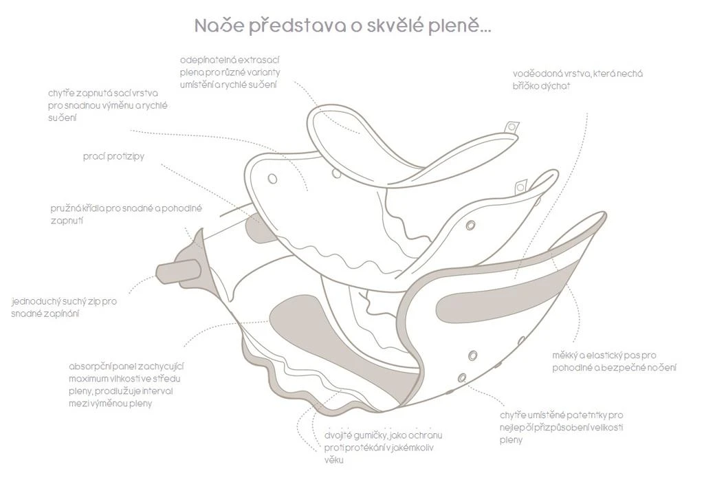 Plena "vše v jednom" pro nejjednodušší přebalování. Jedna velikost od narození po nočník 3-15 kg. Velikost se reguluje pomocí třech řad patentek. Plena se zapíná pomocí pružných suchých zipů. Dvojité gumičky dokonale utěsní okolí nožiček, tak aby vše zůstalo uvnitř pleny. Skládá se ze tří části: 1, vnější nepropustná vrstva, 2, sací vrstva 3. extrasací plena - celý systém je sepnut pomocí patentek.