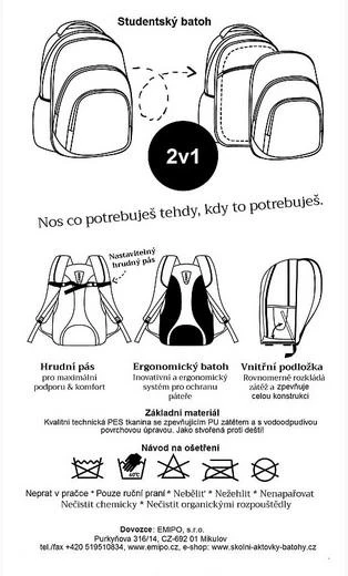 Emipo je česká značka specializující se na výrobu školních aktovek, batohů a dalších školních potřeb. Jejich produkty jsou známé svou nízkou hmotností, pevnou a stabilní konstrukcí a jsou vyrobeny z nepromokavých materiálů. To zajišťuje odolnost a dlouhou životnost, což je ideální pro každodenní používání školáky.