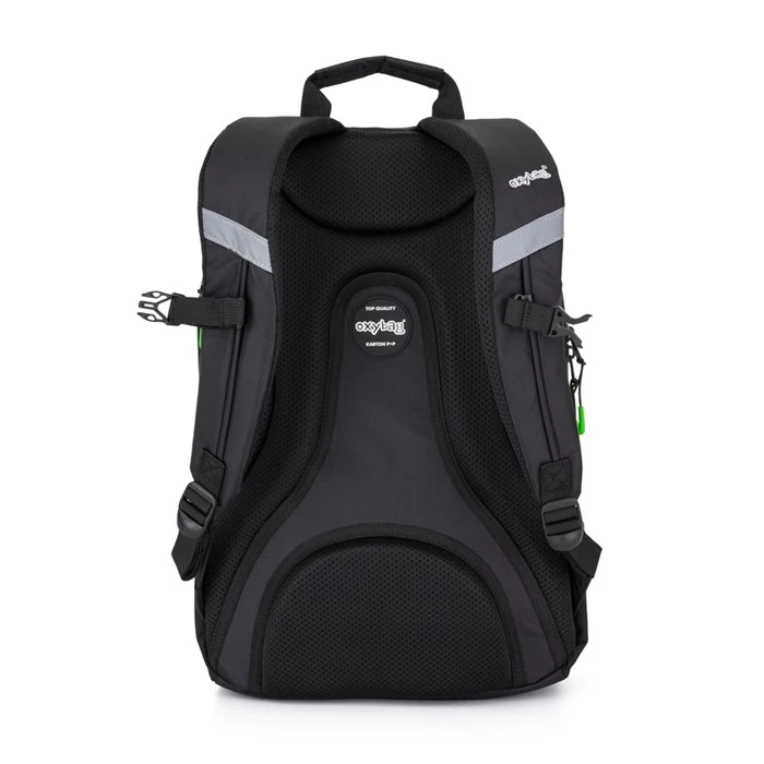 Studentský i volnočasový školní batoh řady Oxy Sport vyniká ergonomicky tvarovanými zády, nastavitelnými polstrovanými ramenními popruhy a hrudním popruhem, díky kterým se pohodlně nosí. Batoh se skládá ze dvou hlavních komor a jedné menší přední kapsičky opatřenými pevnými zipy a praktickými poutky. Uvnitř batohu je vyztužená kapsa na notebook, karabina na klíče, menší kapsa na drobnosti a skrytá kapsa na zádech. Nechybí také boční kapsa na lahev na pití a řada reflexních prvků, díky kterým je batoh lépe viditelný. Batoh je ideální jak pro školáky na druhém stupni tak i pro volnočasové aktivity studentů a dospělých.