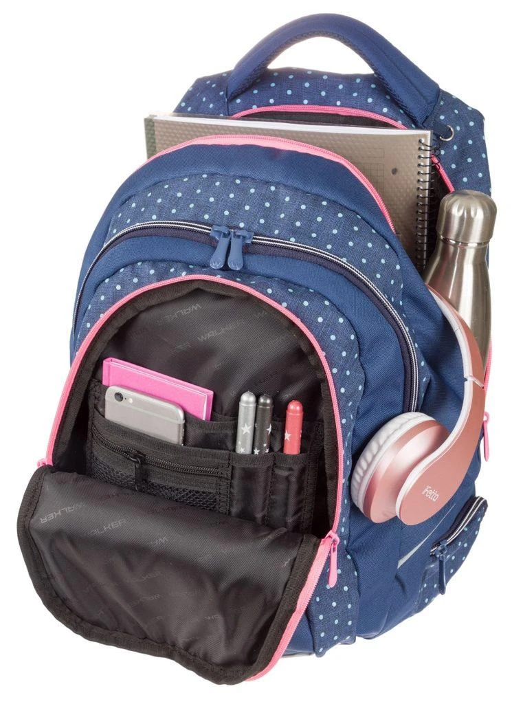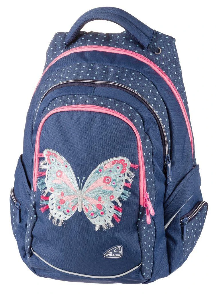 Hlavní komora batohu je nejprostornejší, v horní části má malou kapsičku na zip a vnitřní část je členěna zdvojenou přepážku, která tento prostor člení na tři samostatné části. Druhá komora je jednoduchá bez vnitřního členění, vhodná i pro formát A4. Přední velká kapsa má uvnitř organizér, který tvoří kapsička na mobil, síťovaná kapsička na zip a přihrádky na psací potřeby. Ozdobena je překrásným obrázkem motýlka.