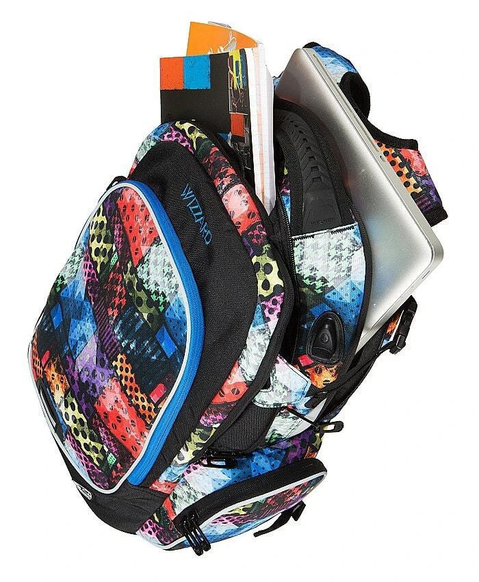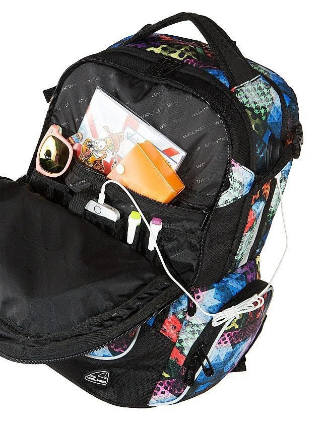 Studentský batoh WALKER WIZZARD patří ke špičce ve své kategorii. Je tříkomorový s velkou přední kapsou na zip. Ta je jednoduchá bez dalšího vnitřního členění. Zadní komora je z obou stran polstrovaná pro bezpečné uložení notebooku nebo většího tabletu. Prostřední komora má v horní části kapsičku na mobil nebo power banku. Součástí je i šňůra s USB konektorem, která vyúsťuje v USB port na vnější straně středového věnce. V horní části tohoto věnce je široké pevné madlo. Velikost obou komor lze regulovat bočními kompresními popruhy. Přední komora, uzavíraná jako obě předchozí zipem, má uvnitř přes celou šířku velkou kapsu na zip, na které je našitý bohatě členěný organizér, který se skládá ze dvou kapsiček a přihrádek na psací potřeby. Na jedné kapsičce je odnímatelná spona s kroužkem na klíče a druhá je uzavíratelná suchým zipem. Po obou bocích batohu je kapsička na zip. Jedna je jednoduchá, ve druhé je síťka s košíkem na uložení lahve na pití. Batoh má bohatě polstrovaná, anatomicky tvarovaná záda. V horní části zádového dílu je umístěno speciální odvětrávání. Nad ním je ještě poutko na zavěšení batohu. Ve spodní části je v bederní opěrce ukryta další kapsa na zip. Dále se tu nachází nastavitelný bederní pásek pro lepší stabilitu batohu na zádech studenta. Nosné řemeny jsou silně polstrovány a ani zde nechybí speciální díl na odvětrávání. Na spojovacím pásku řemenů je umístěna píšťalka pro výstražný hvizd. Na řemenech, bočních kapsách i předním dílu jsou našity reflexními pásky nebo paspule. Dno je vyztuženo a zhotoveno z otěruvzdorného materiálu.
