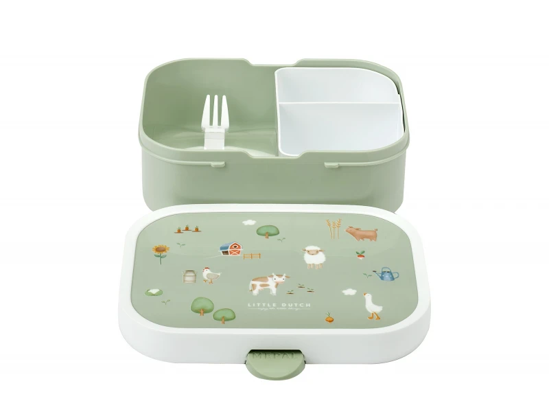Praktický svačinový box nabízí možnost rozdělení na tři přihrádky pro oddělení jednotlivých částí uložené svačinky. Součástí boxu je i malá vidlička, která je ideální pro napichování kousků ovoce či zeleniny. Zacvakávací uzávěr je zárukou bezpečného uzavření obsahu boxu.