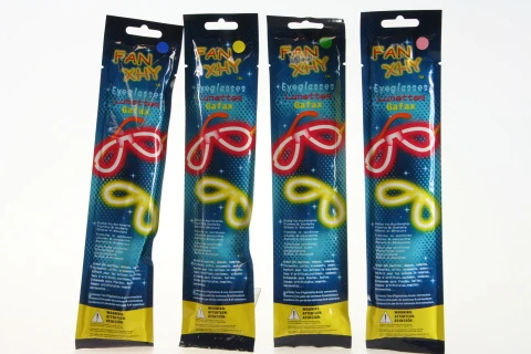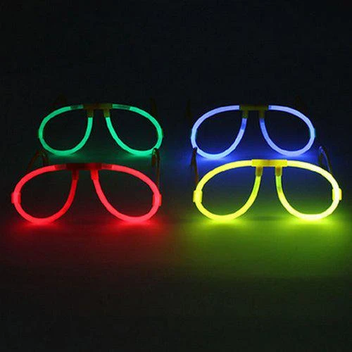 Svítící brýle na párty. Balení obsahuje nožičky na brýle 2 ks, spojovací díl, který spojí nožičky brýlí a tyčky. Svítící tyčky 2 ks v balení - tvoří obroučky brýlí, které ve tmě svítí.