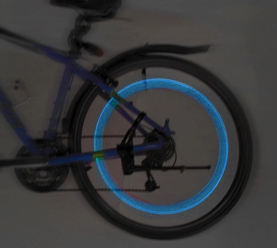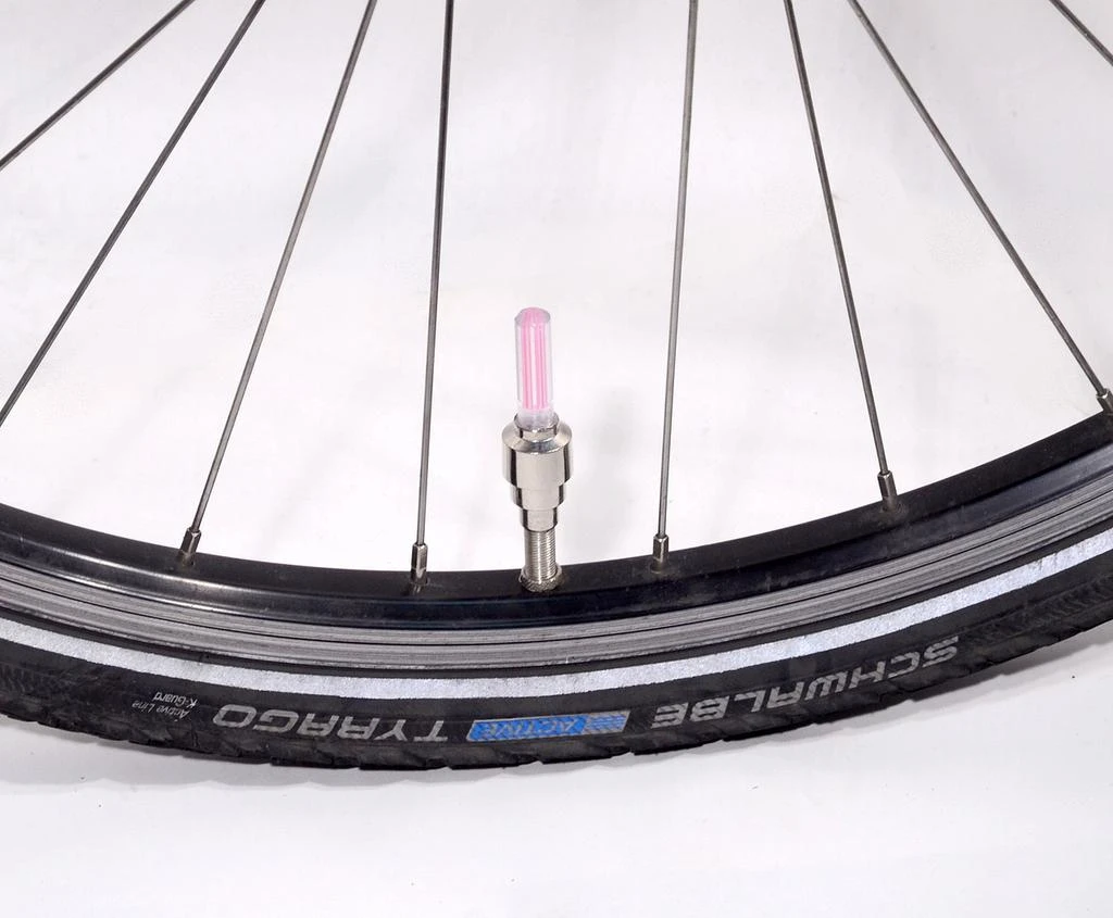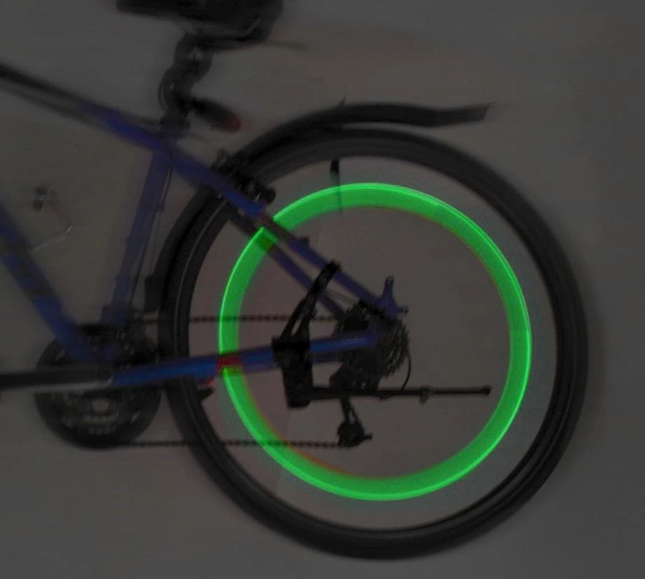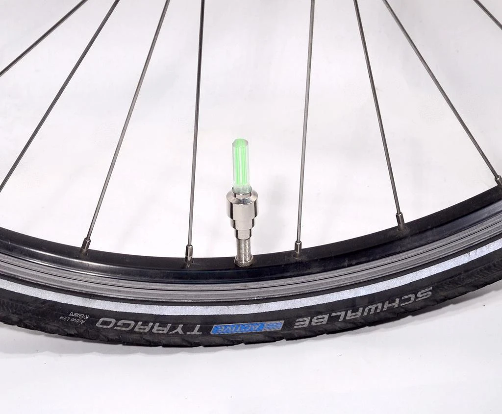 LED Svítící čepička na ventilek jízdního kola. Namontuje se na ventilek kola místo stávající čepičky a během jízdy vytváří ucelený kruh světla, díky kterému je kola výrazně viditelné i v noci.