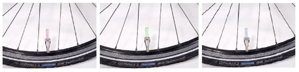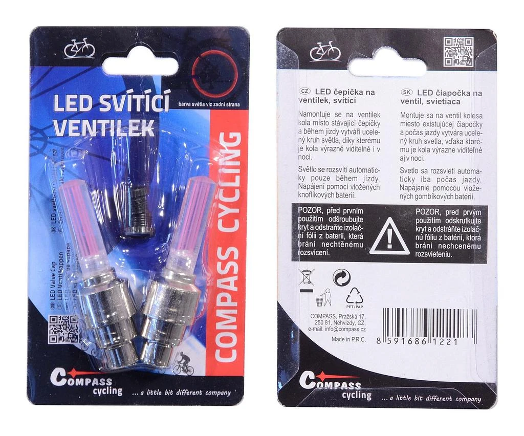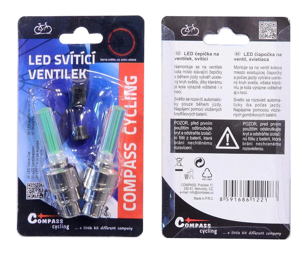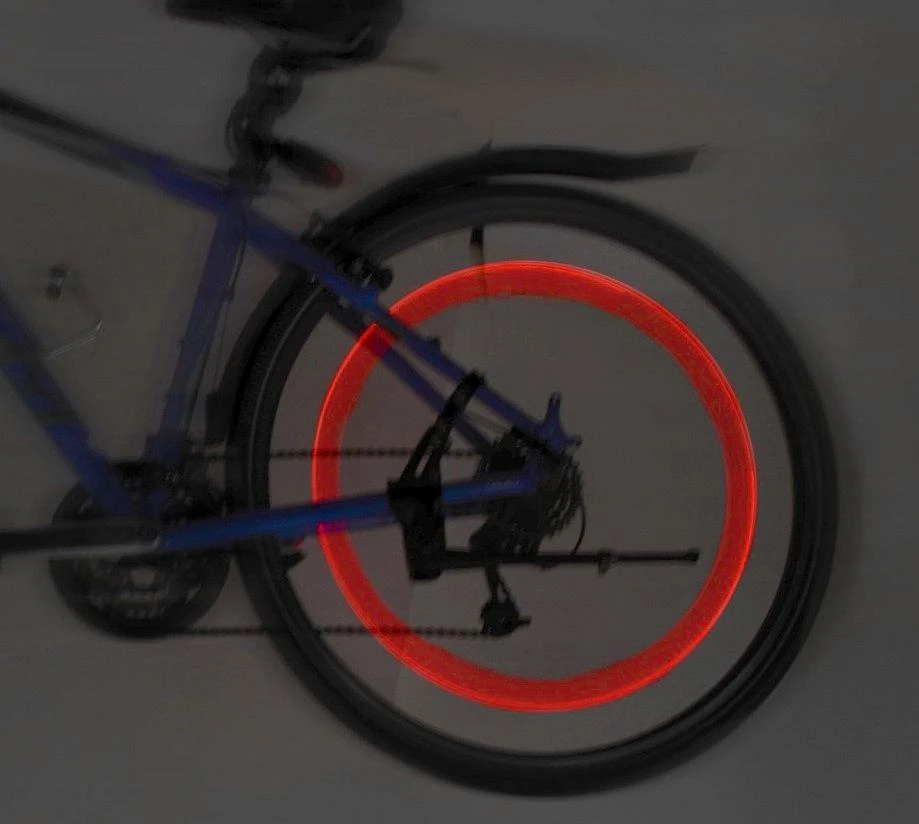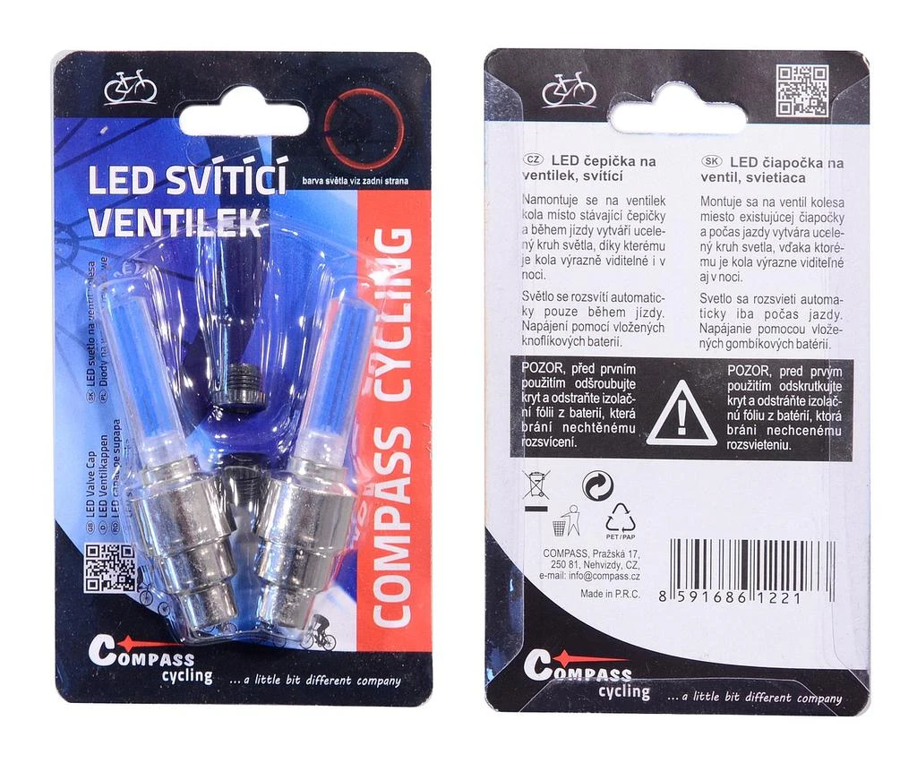 LED Svítící čepička na ventilek jízdního kola. Namontuje se na ventilek kola místo stávající čepičky a během jízdy vytváří ucelený kruh světla, díky kterému je kola výrazně viditelné i v noci.