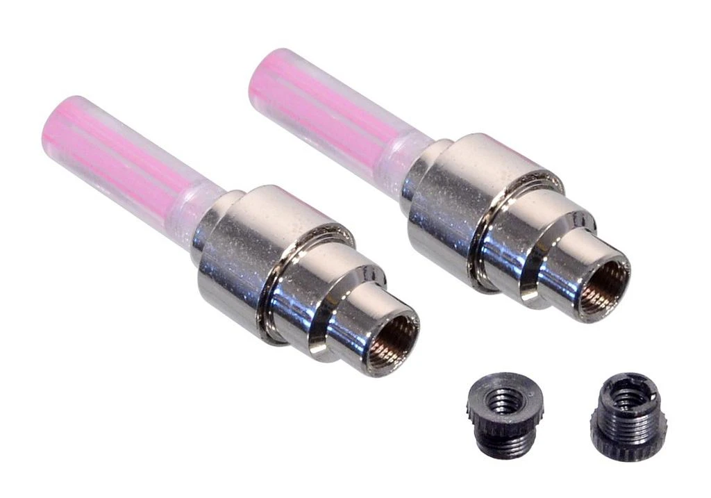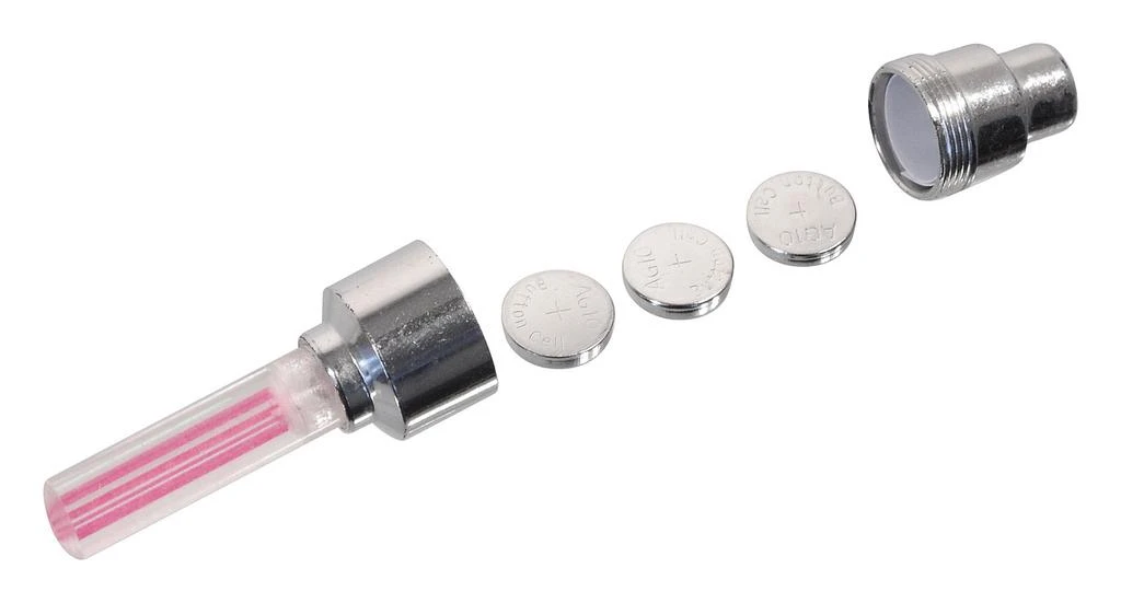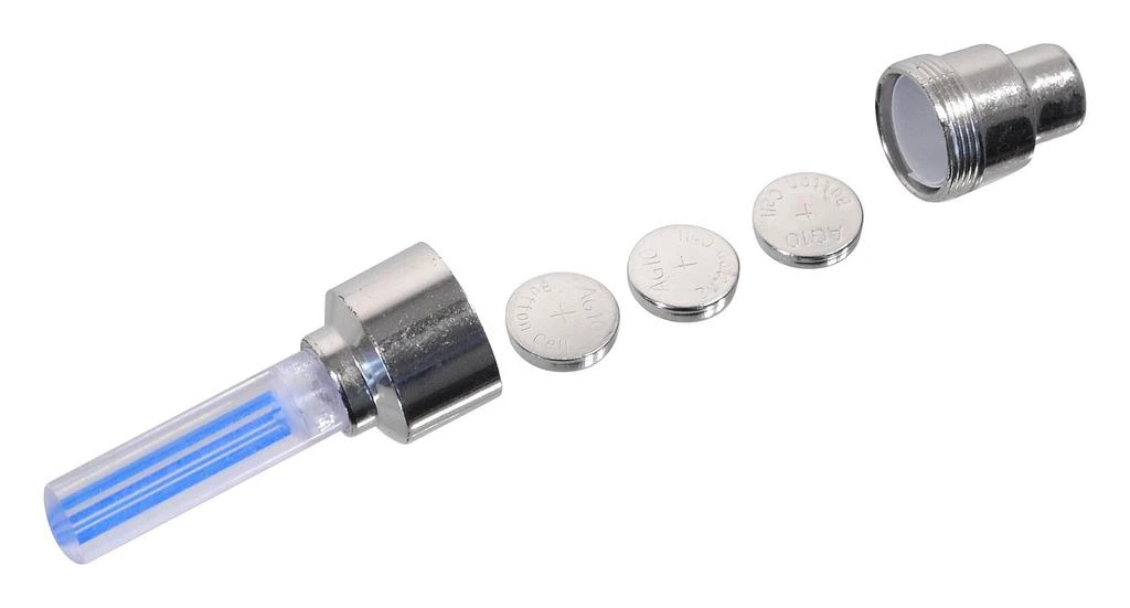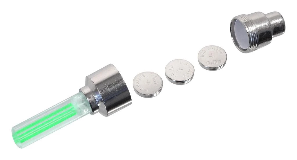 Světlo se rozsvítí automaticky pouze během jízdy. Napájení pomocí vložených knoflíkových baterií. Lze použít jak na kola s autoventilkem, tak i pomocí přiložené redukce na galuskové cykloventilky.