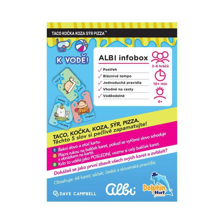 Hra Taco, kočka, koza, sýr, pizza - K vodě obsahuje: 64 voděodolných karet, stahovací sáček, česká a slovenská pravidla.