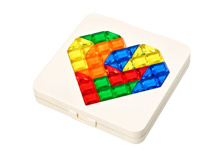 Součástí balení je 120 úrovní zadání se zvyšující se obtížností. Každé zadání je zobrazené jako jednobarevný obrázek – hráč naskládá známé dílky podle předlohy a poté musí v co nejkratším čase doplnit chybějící části tak, aby vznikl kompletní tvar. S rostoucí obtížností se počet chybějících dílků zvyšuje. Pro kontrolu nechybí ani obrázkové řešení s přesnými tvary a barvami jednotlivých dílků.