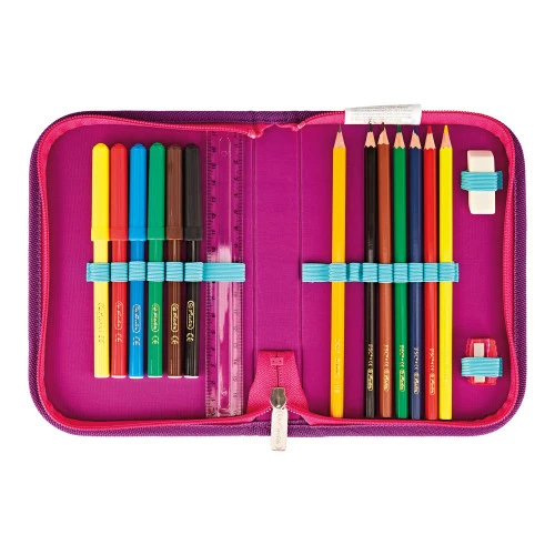 Výbava: penál 16 dílů: 6 fix, 6 pastelek s certifikací FSC, tužka, pravítko, guma, ořezávátko, sáček na cvičky, kulaté pouzdro.