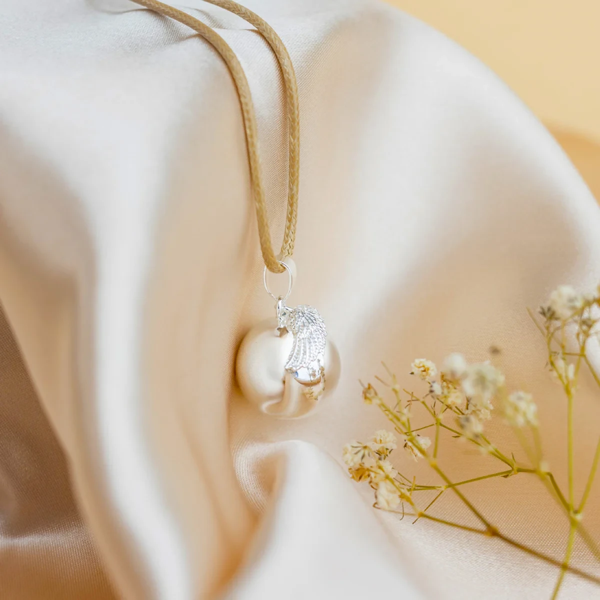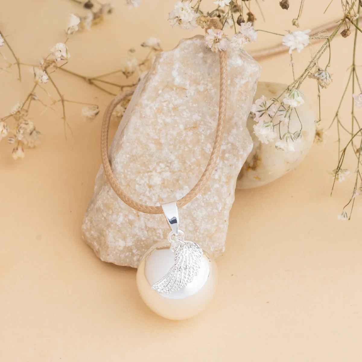Těhotenská rolnička - andělské křídlo stříbrné s koženou černou šňůrkou