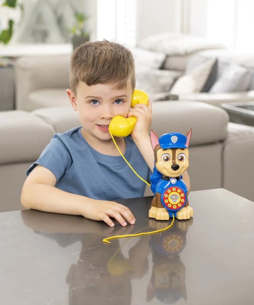 • Telefon v oblíbeném designu Tlapková Patrola. Stisknutím velkého prostředního tlačítka se přehraje melodie z Tlapkové Patroly nebo vyzváněcí tón. • Vytoč čísla, abys slyšel štěňata štěkat. • Vyžaduje 2 x AA baterie, které jsou součástí balení. • Vhodné pro věk 18 měsíců +
