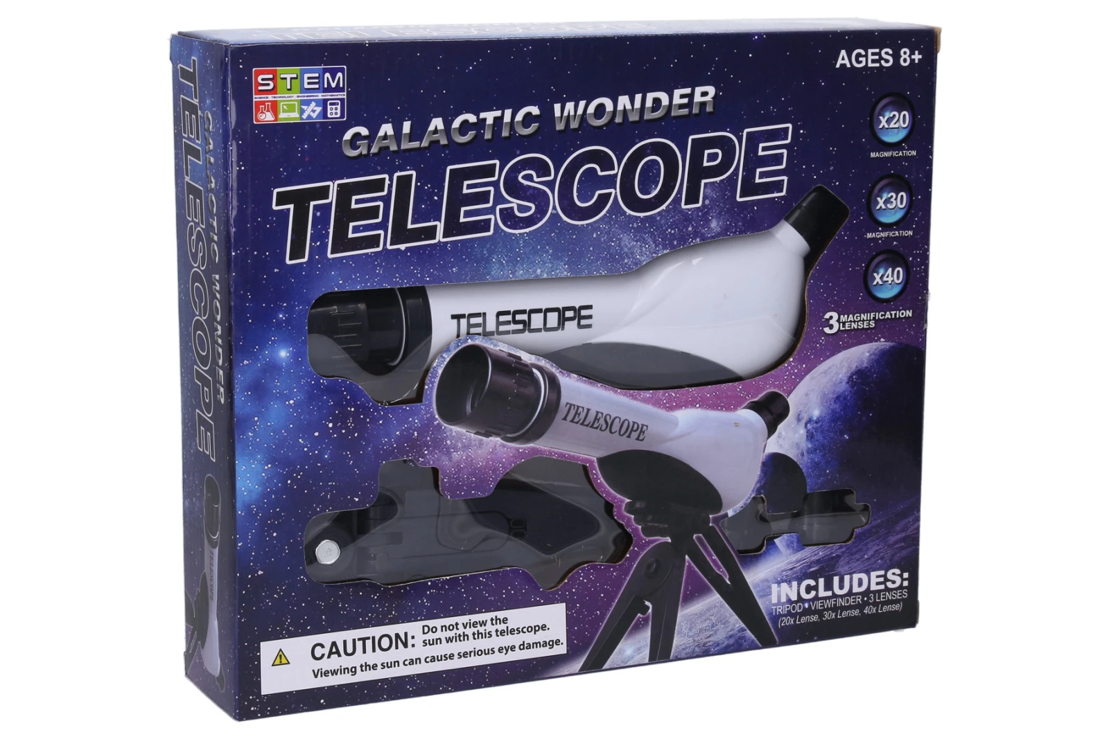 Dalekohled hvězdářský. Zvětšení 20x, 30x a 40x. Otáčením objektivu se zaostřuje. Obraz při pohledu přes teleskop je zrcadlově obrácený.