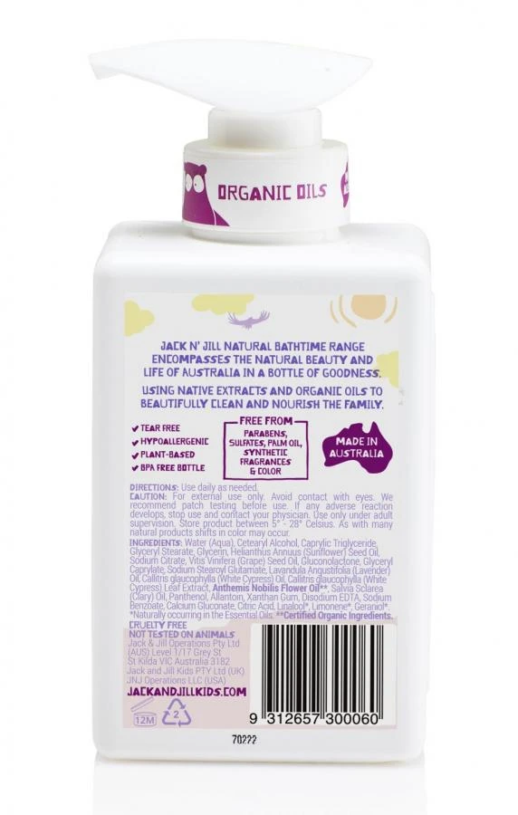 Složení: Water (Aqua), Cetearyl Alcohol, Caprylic Triglyceride, Glyceryl Stearate, Glycerin, Helianthus Annuus (Sunflower) Seed Oil, Sodium Citrate, Vitis Vinifera (Grape) Seed Oil, Gluconolactone, Glyceryl Caprylate, Sodium Stearoyl Glutamate, Lavandula Angustifolia (Lavender) Oil, Callitris glaucophylla (White Cypress) Oil, Callitris glaucophylla (White Cypress) Leaf Extract, Anthemis Nobilis Flower Oil**, Salvia Sclarea (Clary) Oil, Panthenol, Allantoin, Xanthan Gum, Disodium EDTA, Sodium Benzoate, Calcium Gluconate, Citric Acid, Linalool*, Limonene*, Geraniol*. *Naturally occurring in the Essential Oils, **Certified Organic Ingredients.