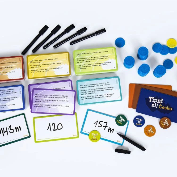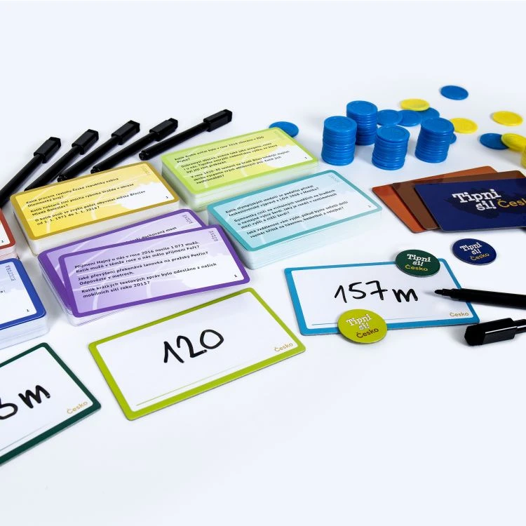 Hra Tipni si Česko obsahuje: 396 karet s otázkami, 6 mazatelných destiček, 6 fixů s mazátkem, 80 plastových bodovacích žetonů, 6 barevných hráčských žetonů a pravidla