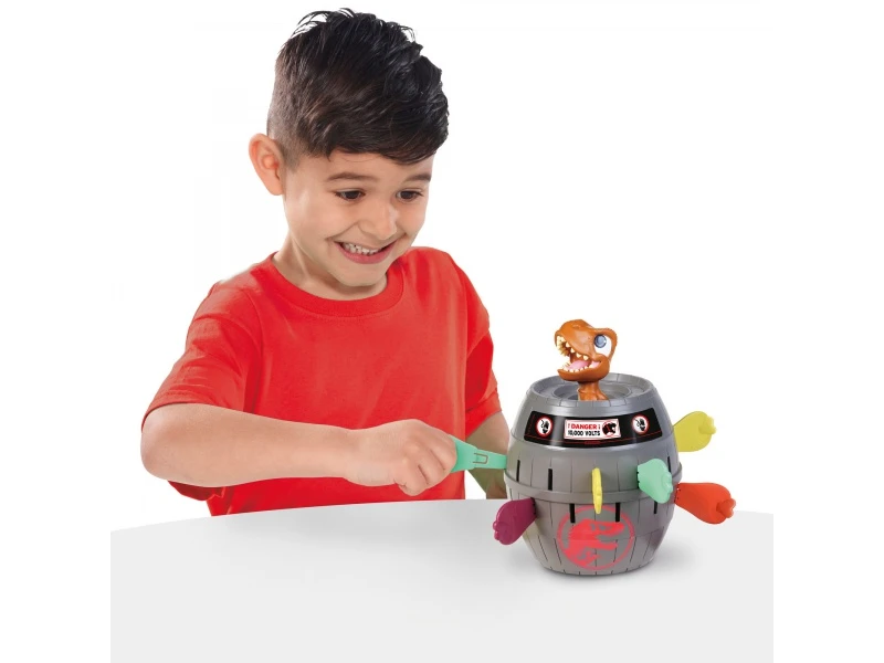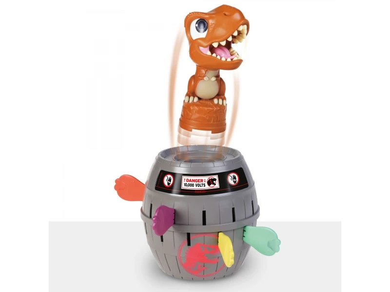 Zbrusu nová a vysoce kvalitní akční hra s T-rexem z Jurského parku. Určitě se mohou zapojit všichni rodinní příslušníci. Aby byla hra při rozbalení kompletní, opatrně přilepte přiložené nálepky na určená místa. T-Rexe umístěte na sud a přitiskněte dolů. Pokaždé bude vykukovat jinak. V této hře se tyčky (ve tvaru kostí) zabodávají do sudu. Každý hráč si zvolí svou oblíbenou barvu zastrkovací tyčky a bude doufat, že právě jemu T-Rex nevyskočí. Musíte být ale opatrní, stačí jeden chybný krok a T-Rex vyletí ven ze sudu!