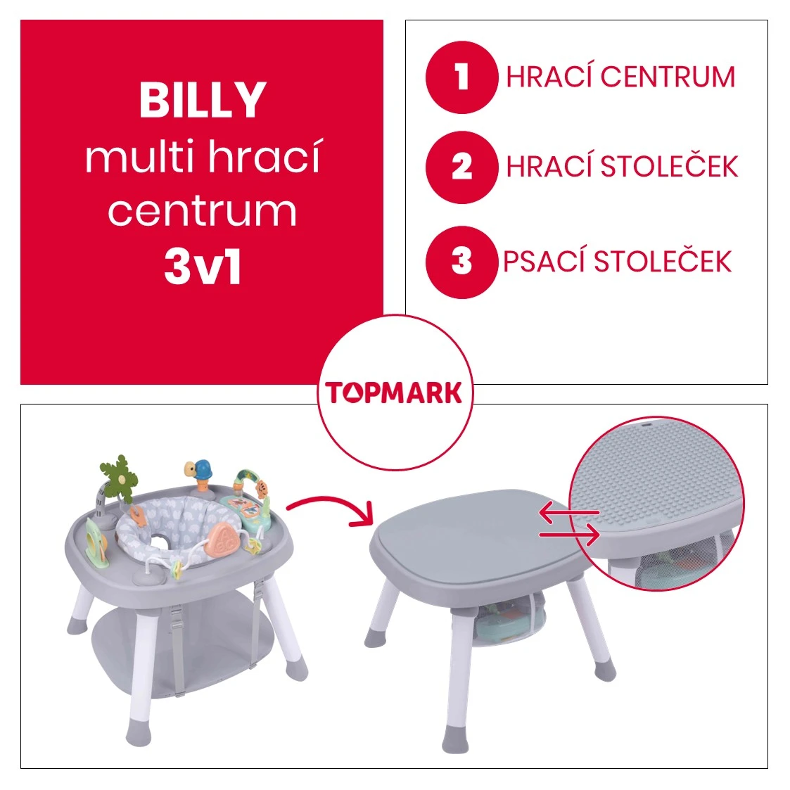 Hrací centrum lze po vyjmutí hraček přeměnit v praktický hrací nebo pracovní stoleček, stačí si jen zvolit vybranou stranu pracovní desky (hladkou nebo herní).
