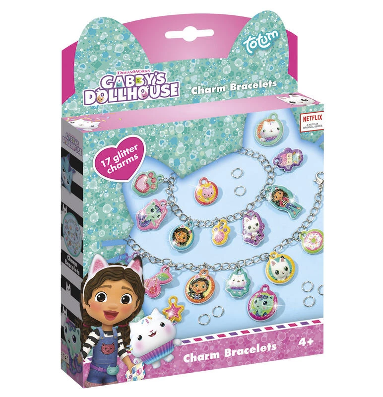 Kreativní sada pro všechny malé milovníky Gábinina kouzelného domku. Děti si mohou vyrobit dva originální řetízkové náramky a ozdobit je plastickými přívěsky s oblíbenými postavičkami. Balení obsahuje 34 třpytivých plastických samolepek, dva řetízkové náramky, kovové kroužky a návod. Tvoření podporuje fantazii, jemnou motoriku i radost z vlastnoručně vyrobeného šperku.