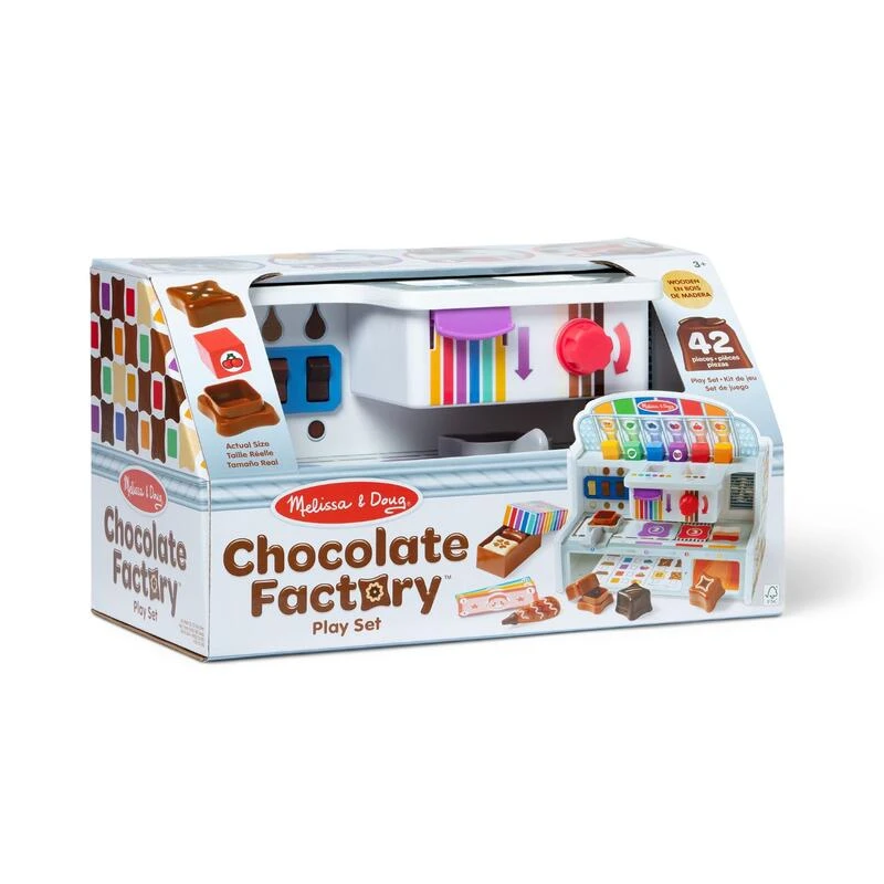 Hrací sada Chocolate Factory je skvělý způsob, jak podpořit jemnou motoriku, dovednosti v oblasti čísel a přiřazování, stejně jako rozpoznávání barev, komunikaci, kooperativní hru a narativní myšlení.