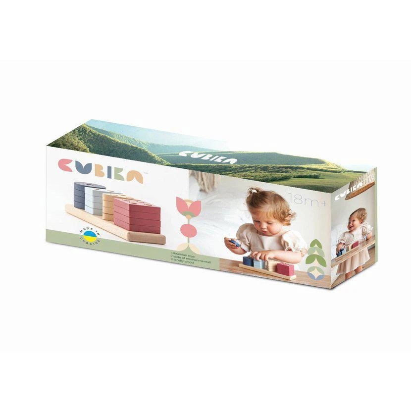 Cubika je značka dřevěných hraček vyrobených pouze z ekologicky pěstovaného dřeva s velmi precizním opracováním a líbivým designem a tento výrobek patří do nové kolekce vyrobené v pastelových barvách.