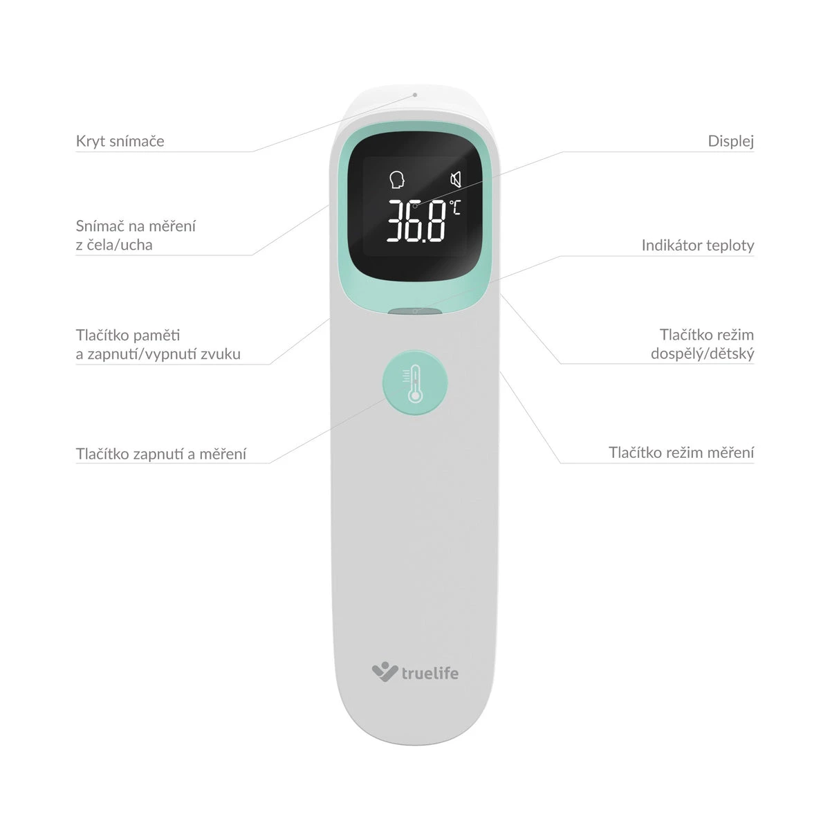 TrueLife Care Q9 nabízí tři režimy měření teploty. Kromě klasického měření tělesné teploty dokáže změřit i předměty, povrchy, nebo tekutiny. Snadno tak můžete zkontrolovat třeba kojeneckou stravu nebo čaj. U měření tělesné teploty osob máte možnost volby mezi měřením z teploty z ucha, nebo čela. Teploměr disponuje i dětským režimem, který je uzpůsoben pro osoby mladší 12 let.