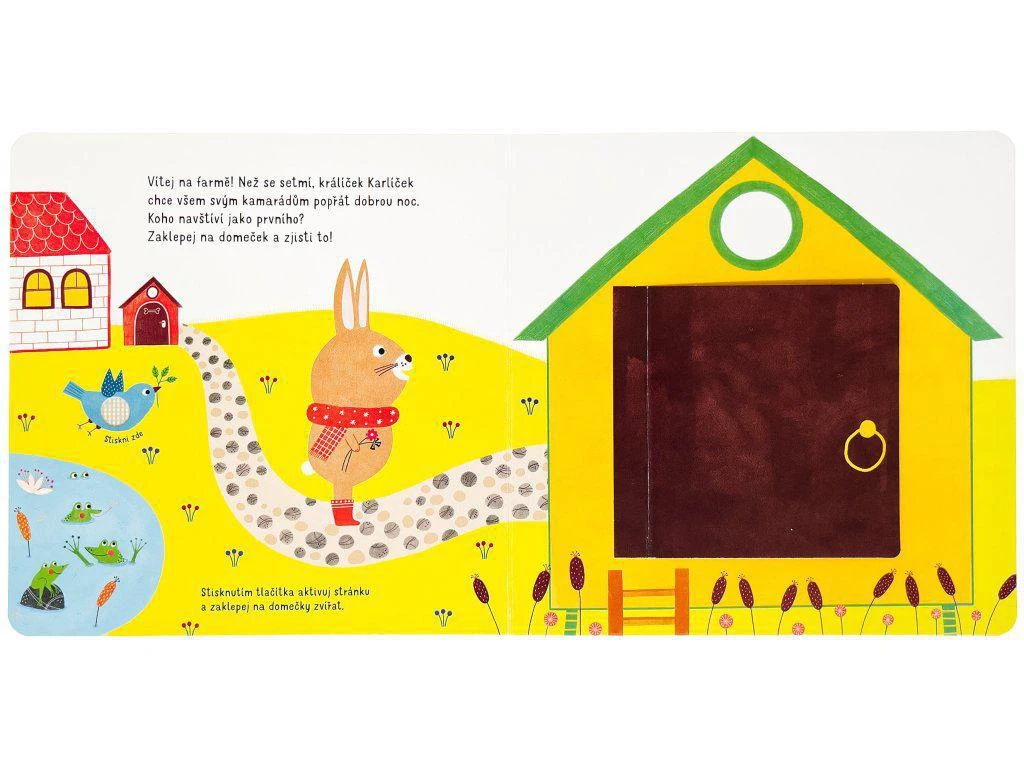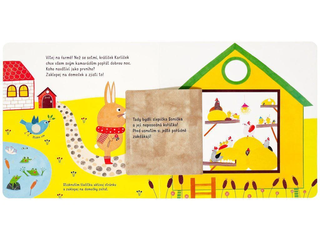 Králíček Karlíček chce všem svým kamarádům na farmě popřát dobrou noc. Ale kde kdo bydlí? Tato interaktivní zvuková kniha zaujme malé děti a procvičí jejich motorické schopnosti. Veselé a nápadité ilustrace představí dětem zvířata z farmy.