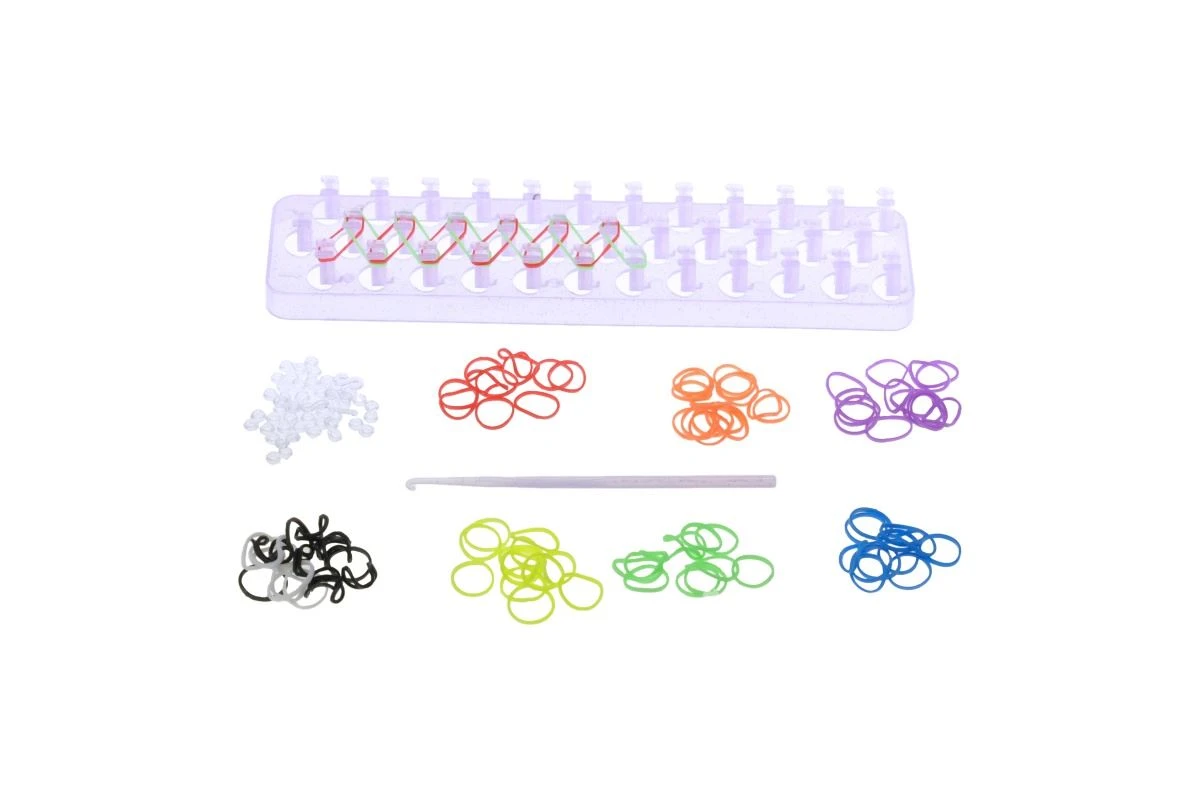 Balení obsahuje 600 ks gumiček v pastelových barvách, nářadí a pletací stav. Produkt je vyroben z nezávadného materiálu.