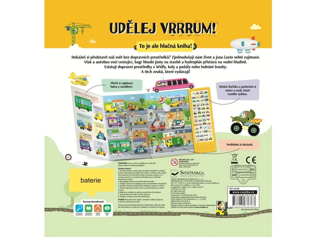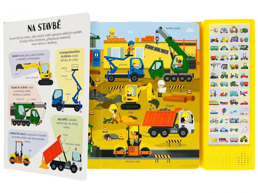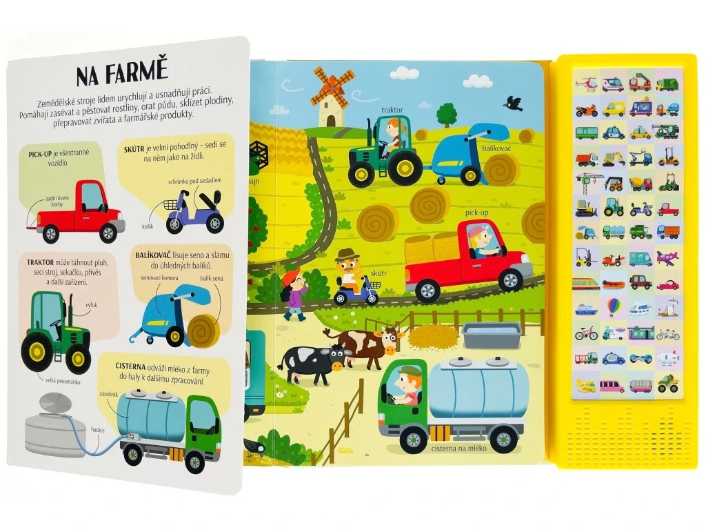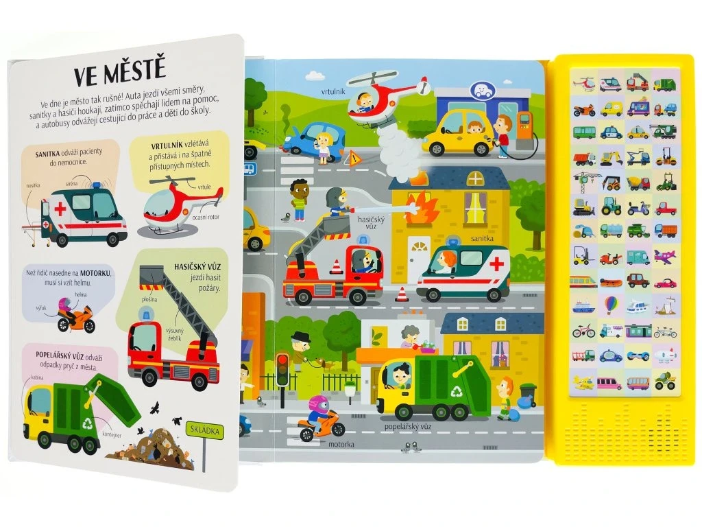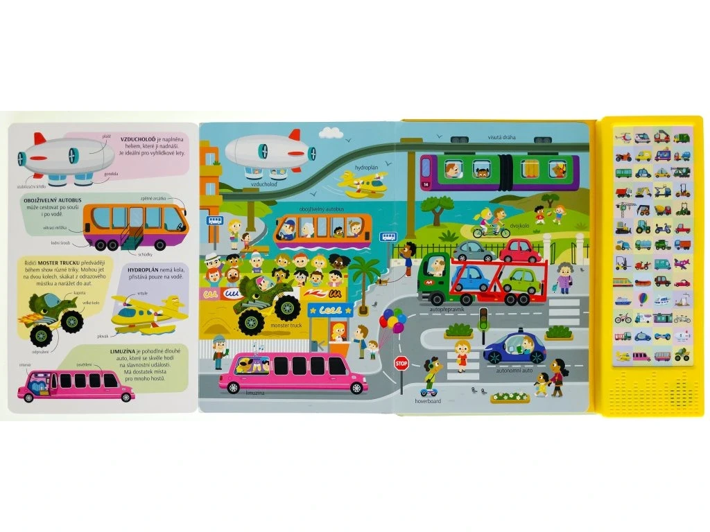 Dokážeš si představit náš svět bez dopravních prostředků? Zjednodušují nám život a jsou často velmi zajímavé. Vlak a autobus vozí cestující, bagr hloubí jámy na stavbě a hydroplán přistává na vodní hladině. Existují dopravní prostředky s křídly, koly a pedály nebo lodními šrouby. A těch zvuků, které vydávají! Tak neváhej, rozlož stránku, stiskni tlačítko a poslechni si název a zvuk, které vozidlo vydává. Prohlédni si obrázek, najdi vozidlo a v levé části si o něm přečti pár zajímavostí. Zvukový modul obsahuje 50 tlačítek se zvuky.