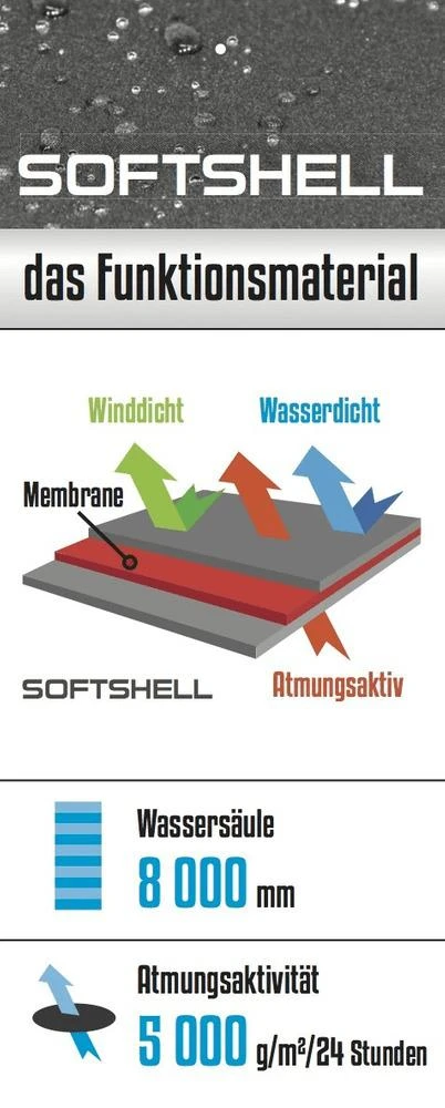 * Vnější materiál funkční Softshell s PU membránou, vodní sloupec 8000mm, prodyšnost 5000g/m2/24h