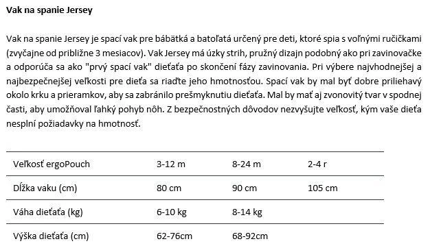 Vak na spaní pro miminka a batolata určený pro děti, obvykle od přibližně 3 měsíců. Vak na spaní Jersey má úzký střih, pružný design podobný jako u zavinovačky a doporučuje se jako „první spací pytel“ dítěte po skončení fáze zavinování. Design schválený pro bezpečný spánek je vyroben z měkké, elastické organické bavlny s certifikátem GOTS, která je netoxická a šetrná k pokožce dítěte. Ergonomicky navržený vak má zvonovou spodní část, která podporuje zdravý vývoj kyčlí a je schválena Mezinárodním institutem pro dysplazi kyčlí a materiál je elastický, aby se dítě mohlo během spánku volněji pohybovat a zůstat v pohodlí.